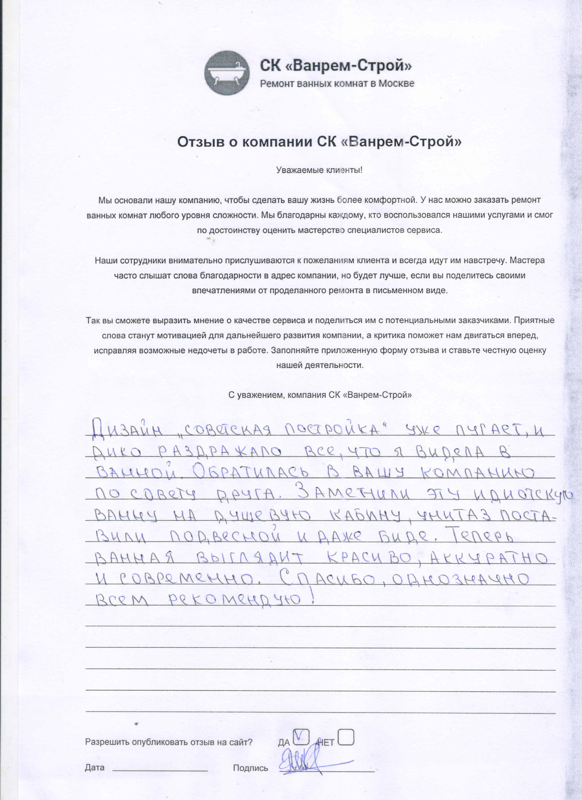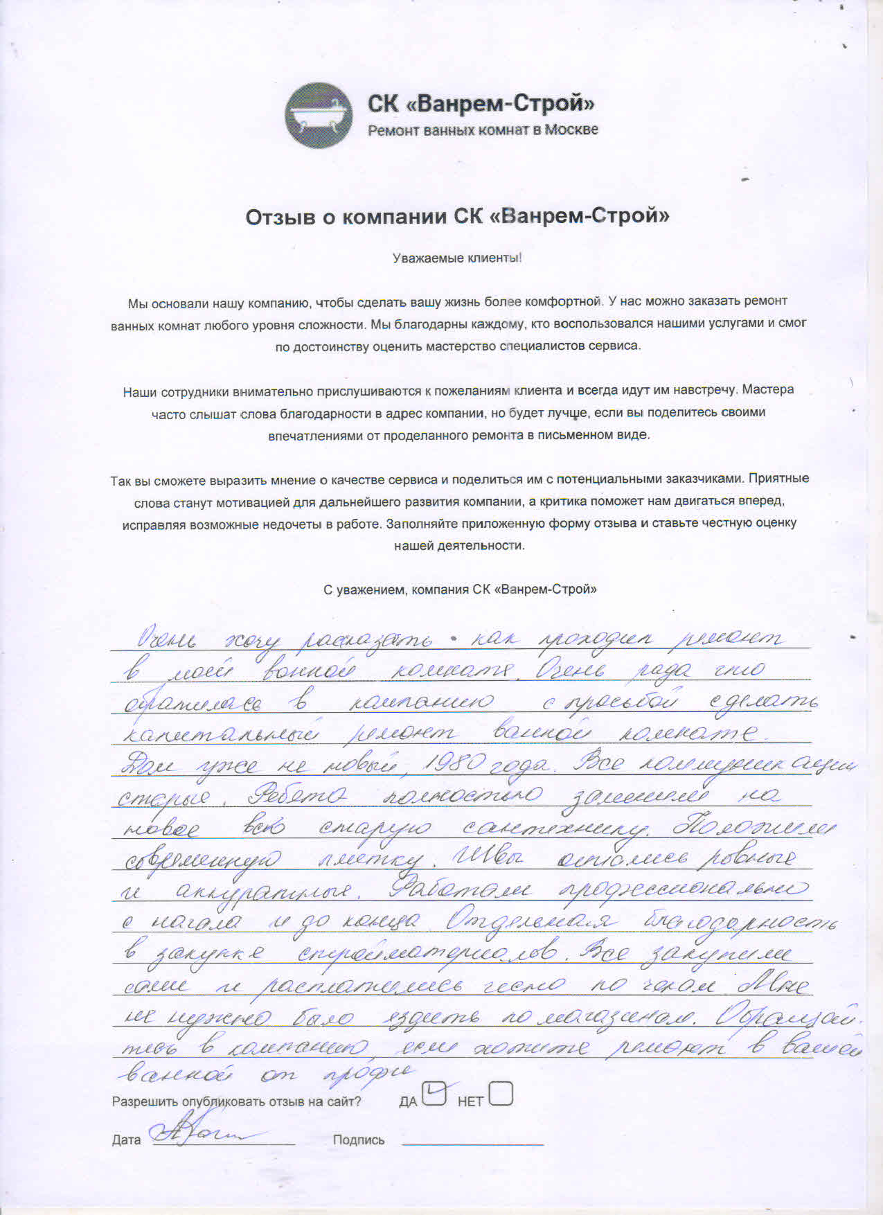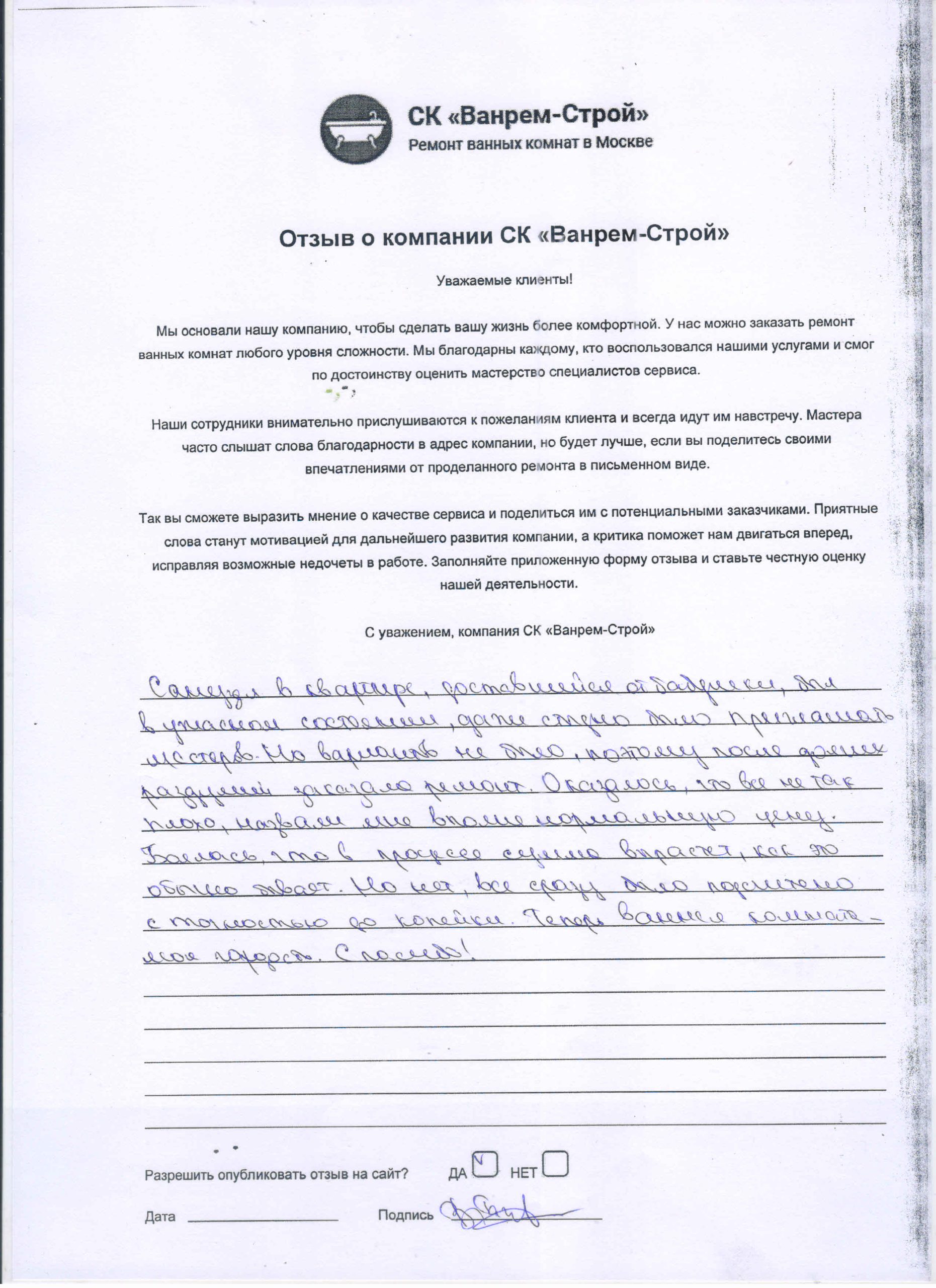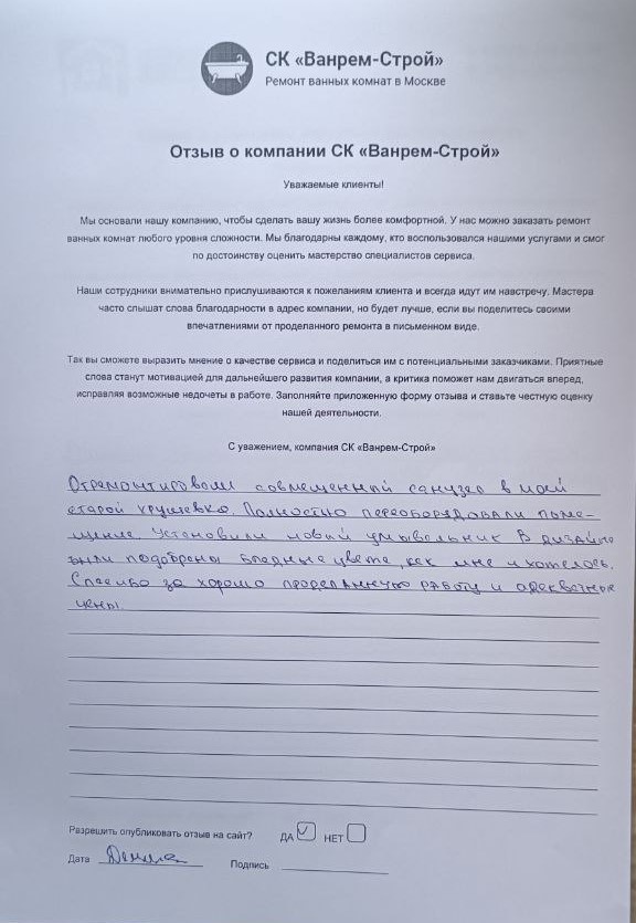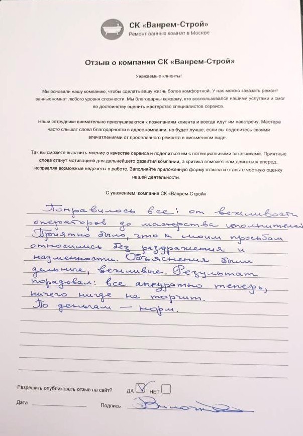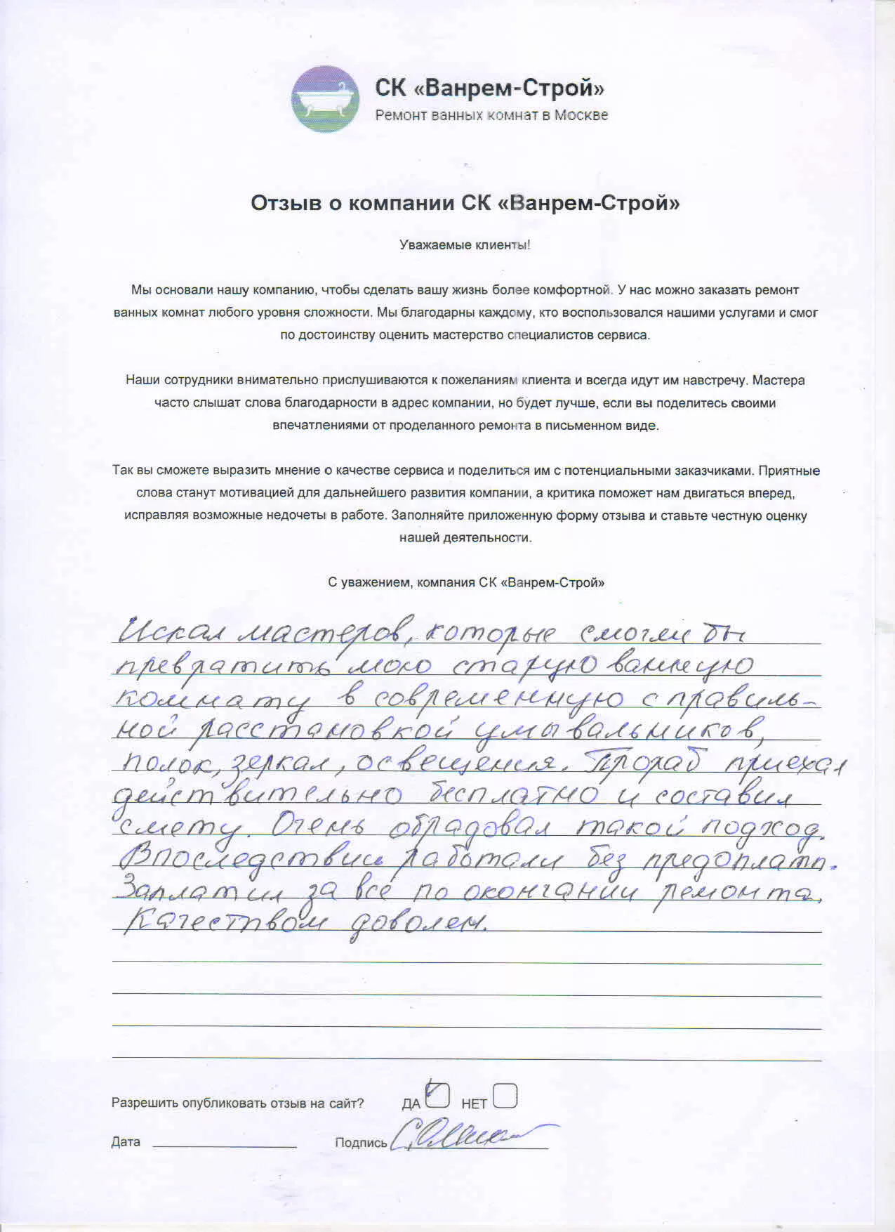 Реальные заказчики дают объективную оценку комплексной работы коллектива сотрудников СК «Ванрем-Строй». Для получения достоверной информации о качестве предоставляемых нами услуг по ремонту ванных комнат, санузлов и туалетов, изучите отзывы клиентов нашей компании.