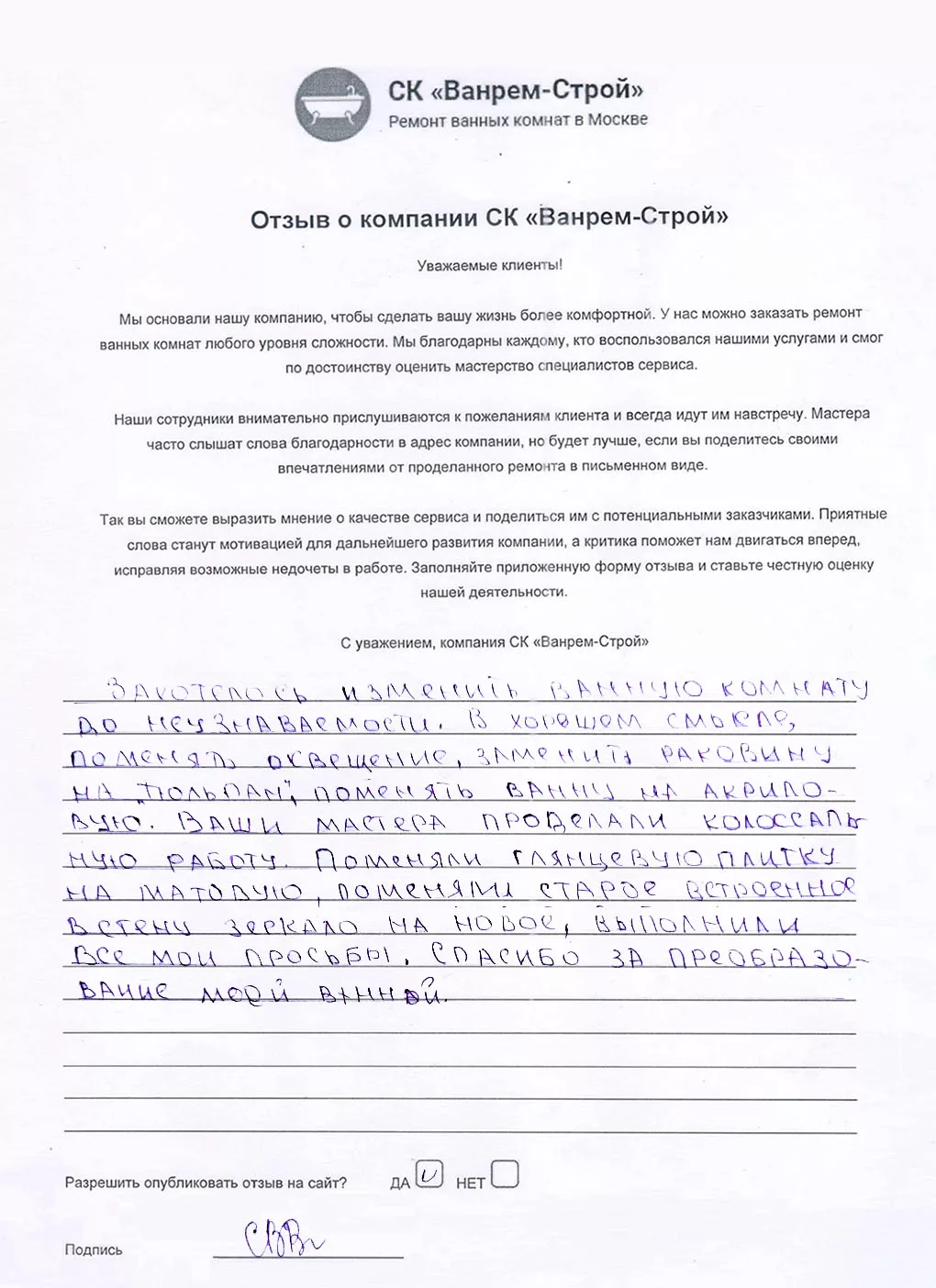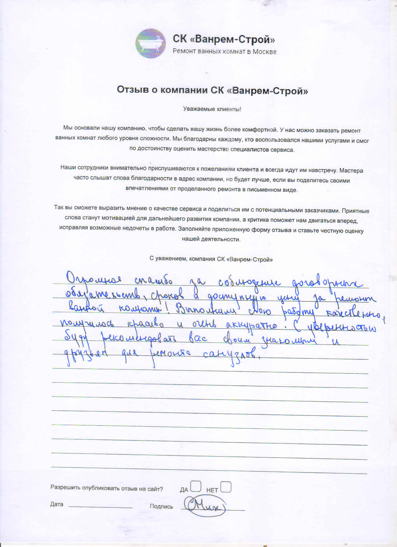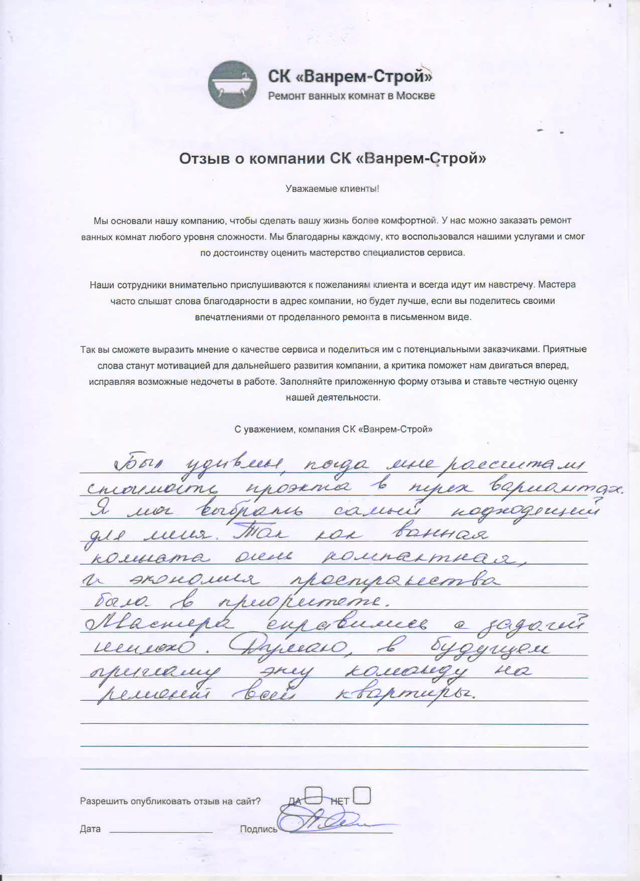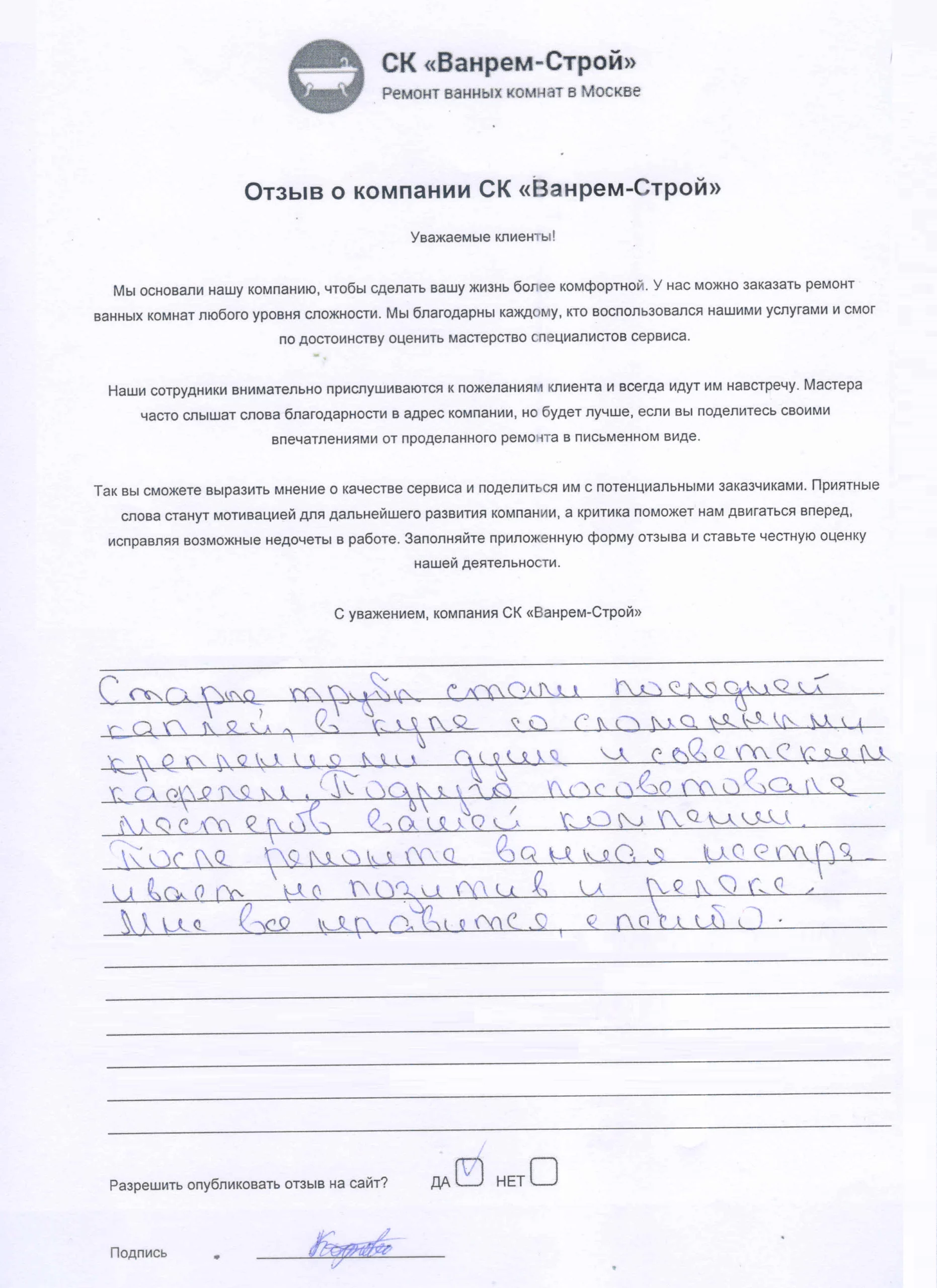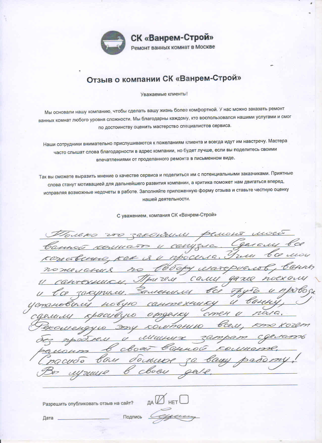 Реальные заказчики дают объективную оценку комплексной работы коллектива сотрудников СК «Ванрем-Строй». Для получения достоверной информации о качестве предоставляемых нами услуг по ремонту ванных комнат, санузлов и туалетов, изучите отзывы клиентов нашей компании.