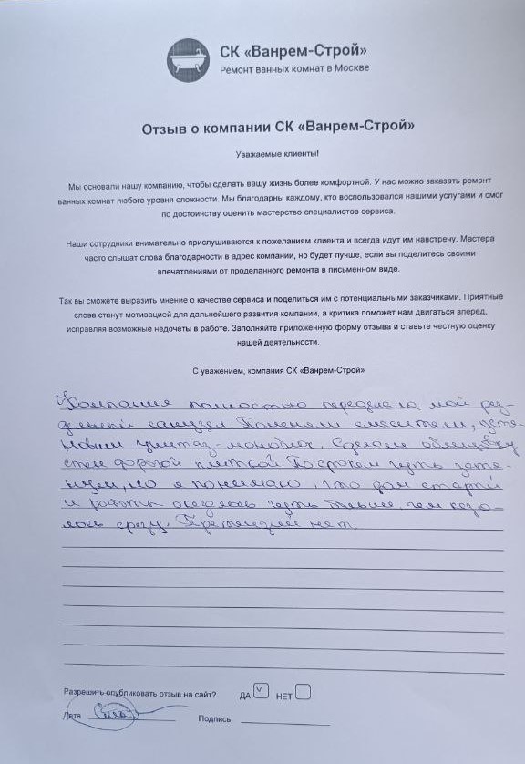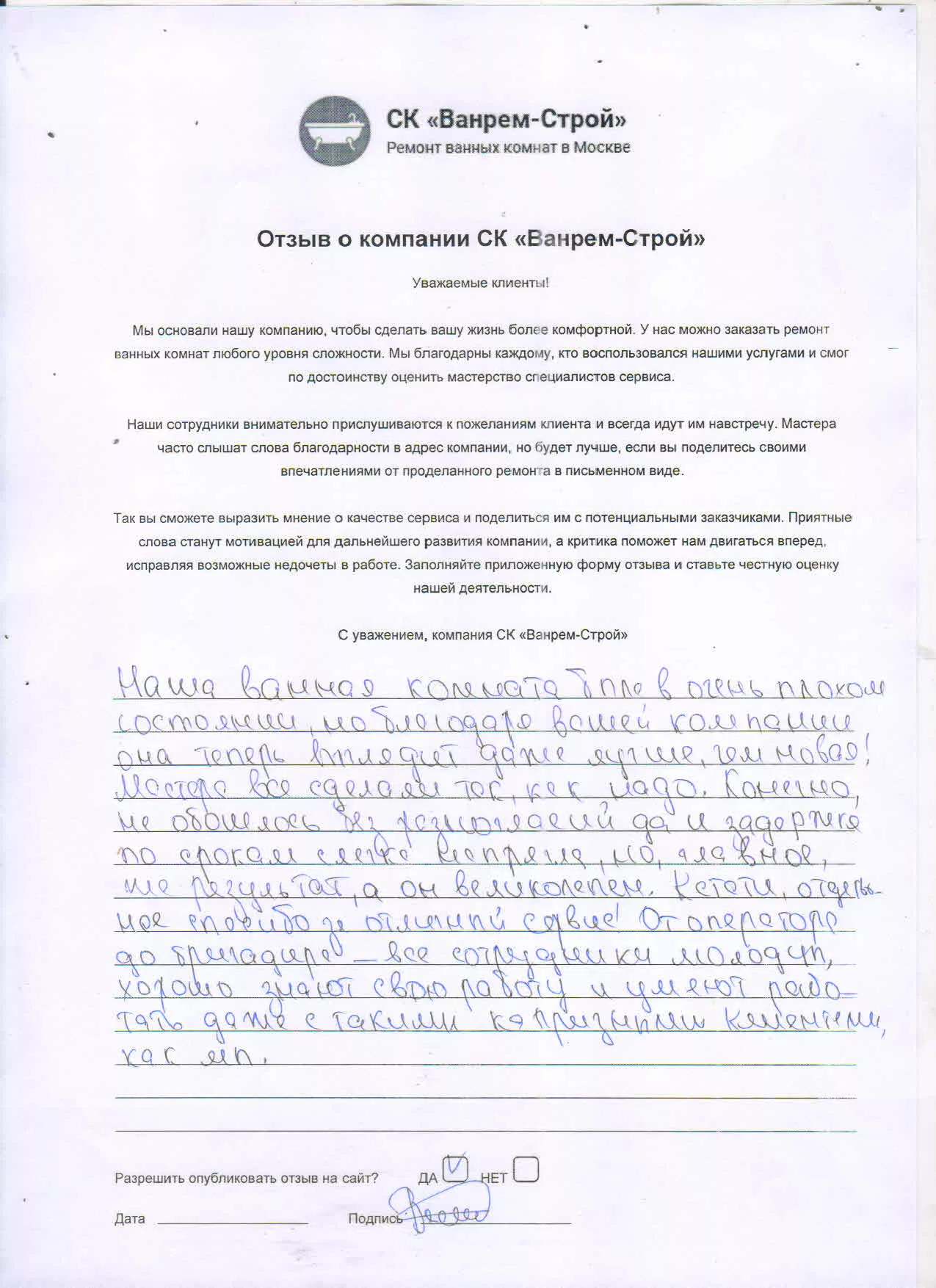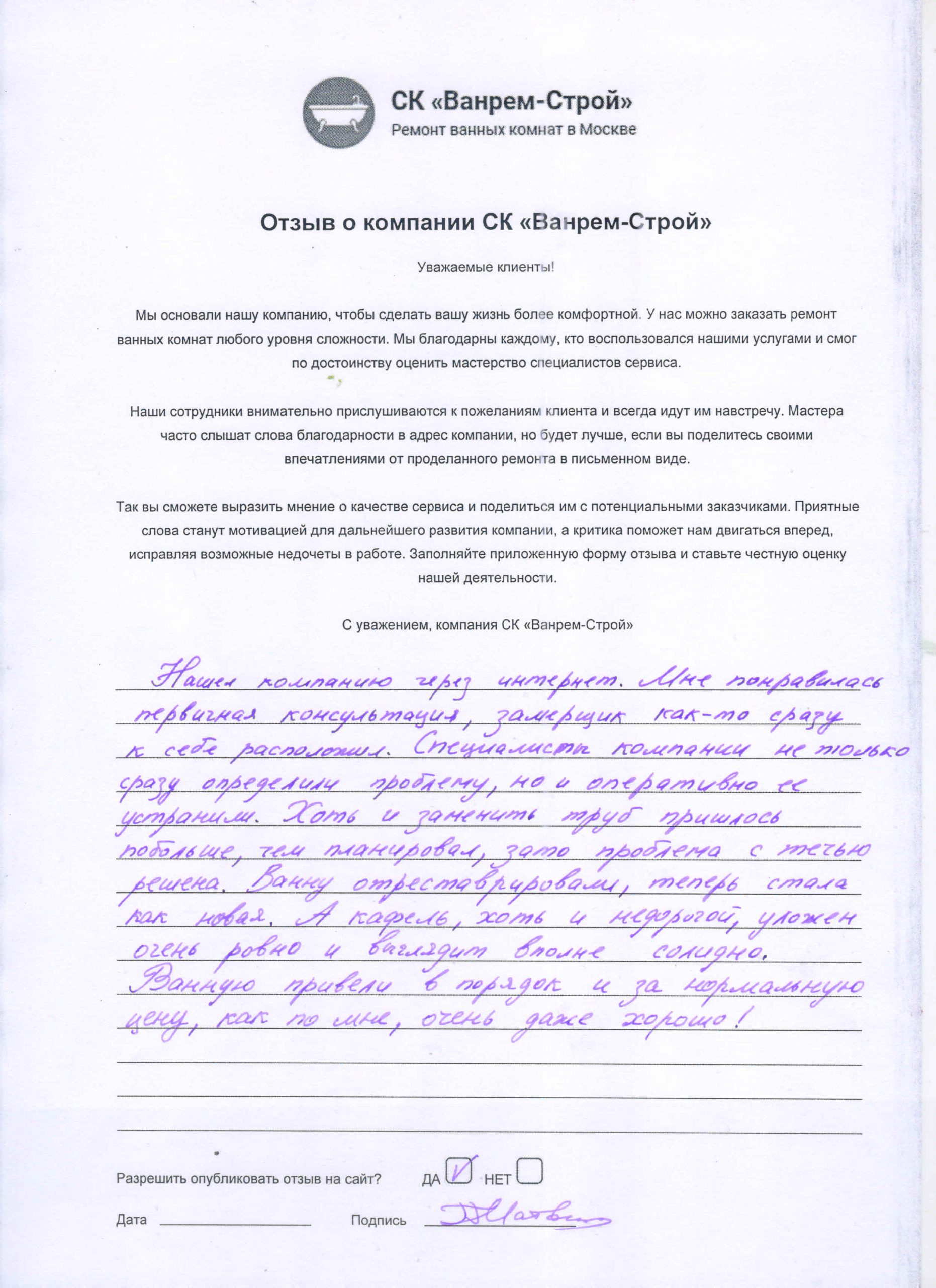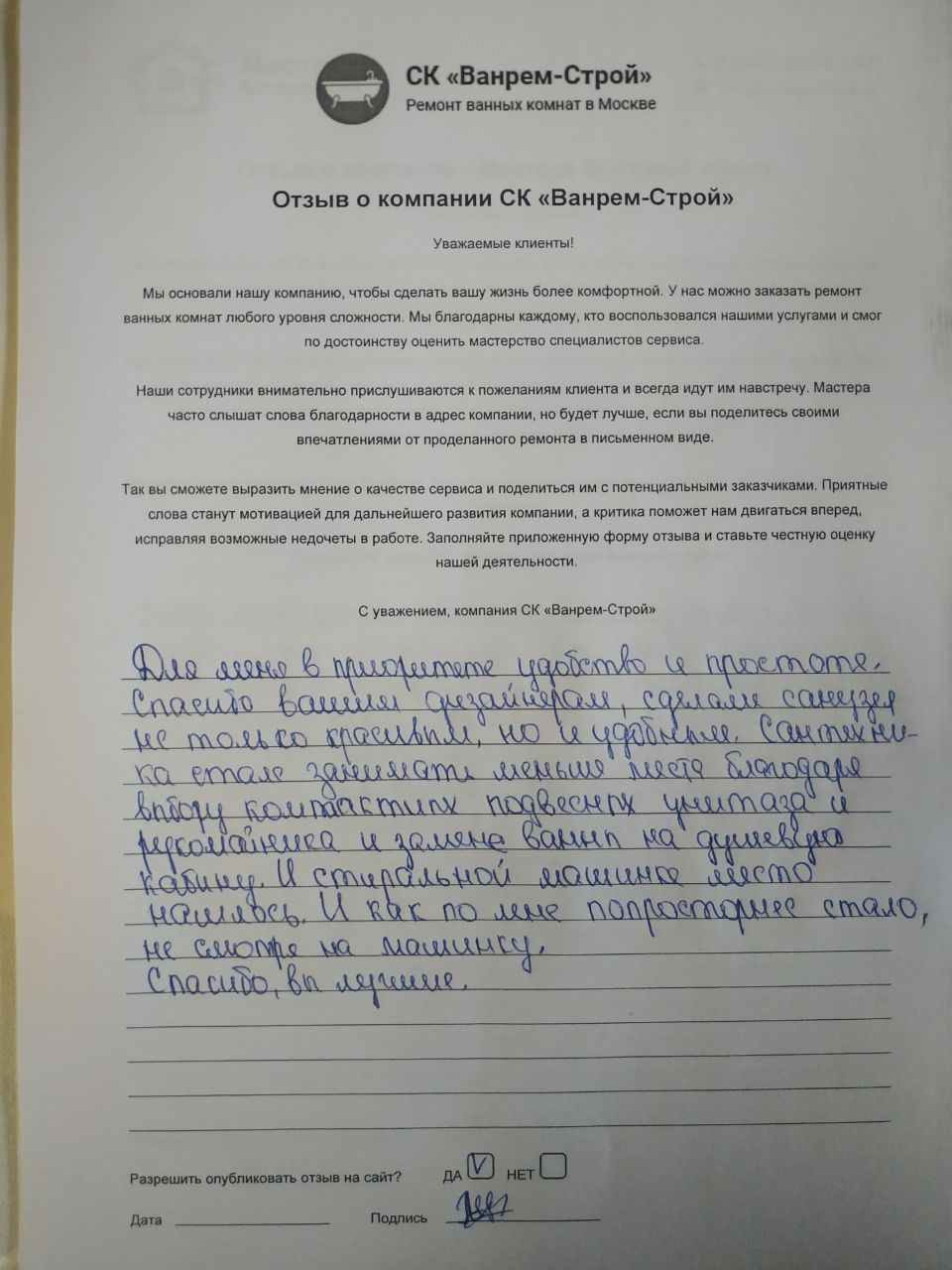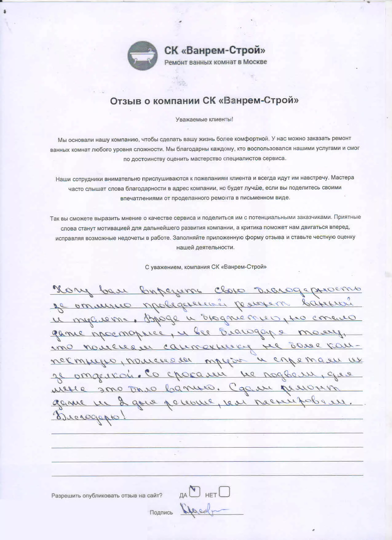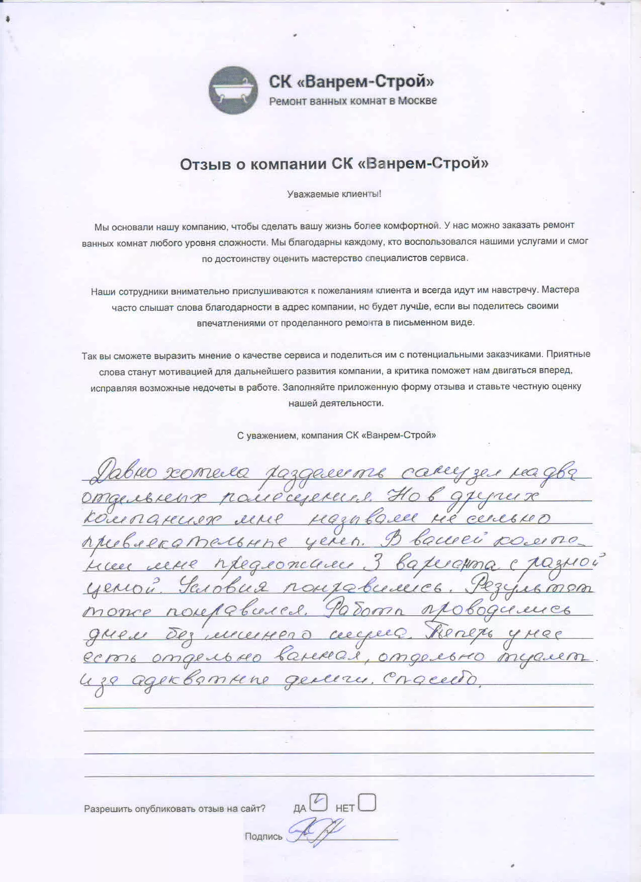 Реальные заказчики дают объективную оценку комплексной работы коллектива сотрудников СК «Ванрем-Строй». Для получения достоверной информации о качестве предоставляемых нами услуг по ремонту ванных комнат, санузлов и туалетов, изучите отзывы клиентов нашей компании.