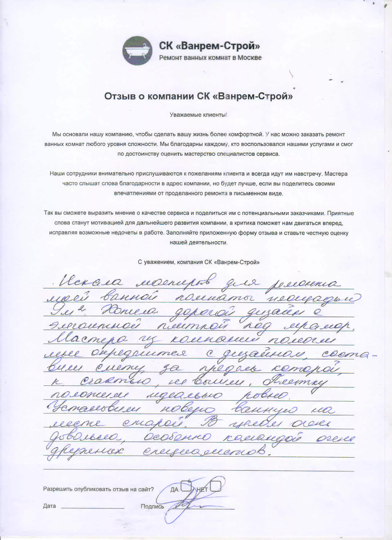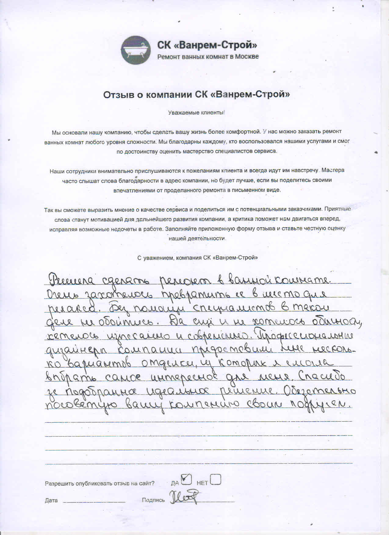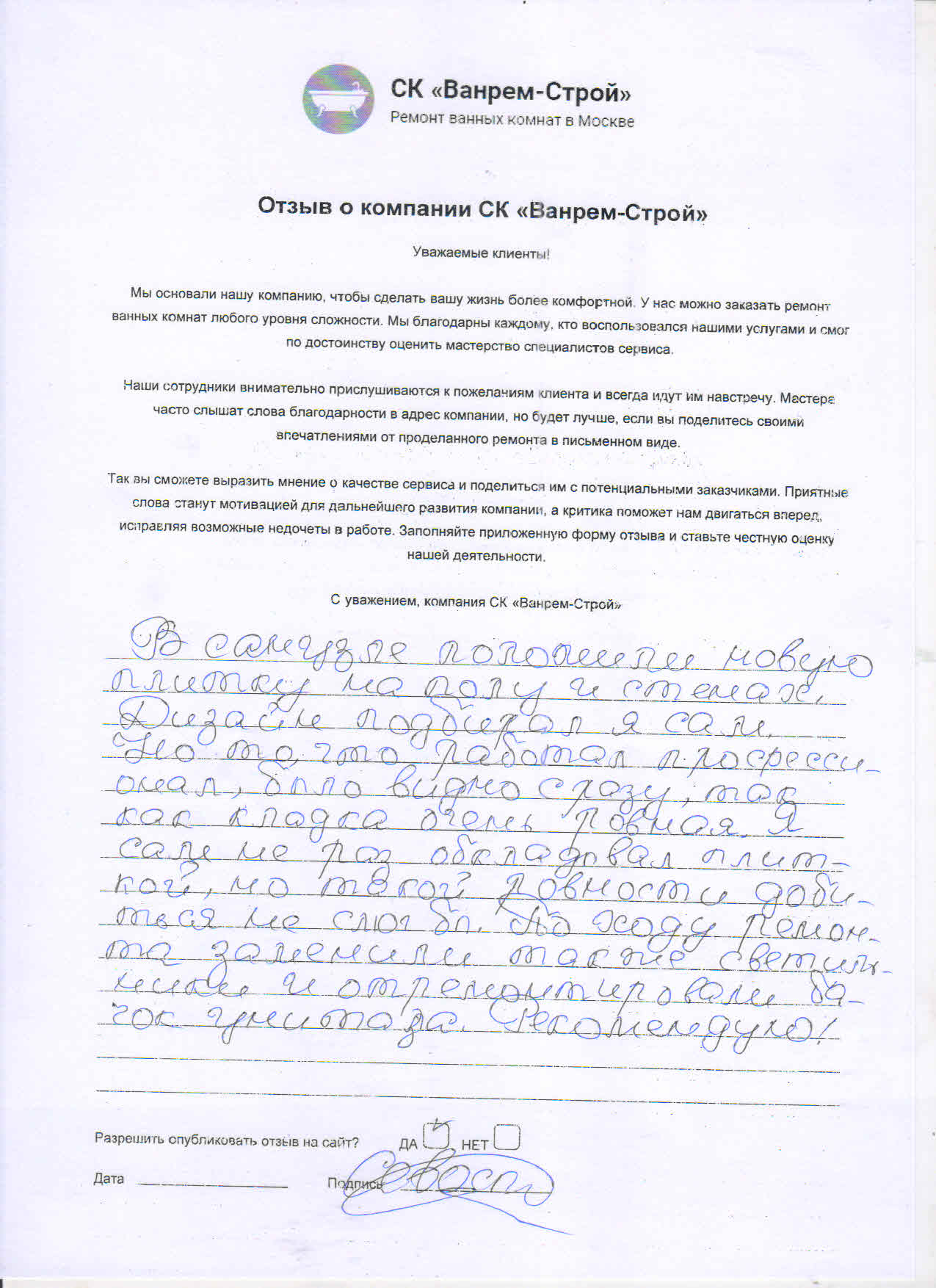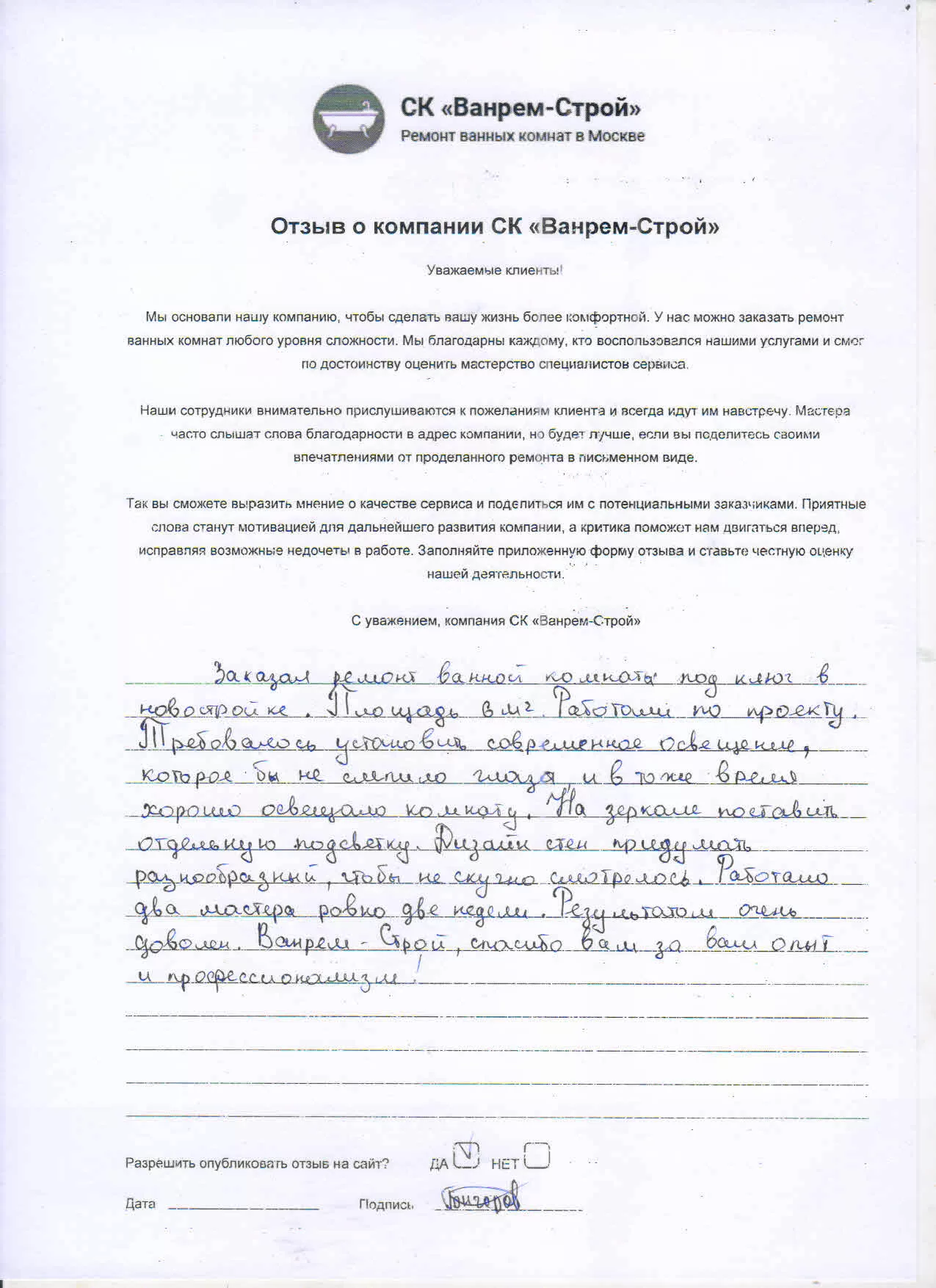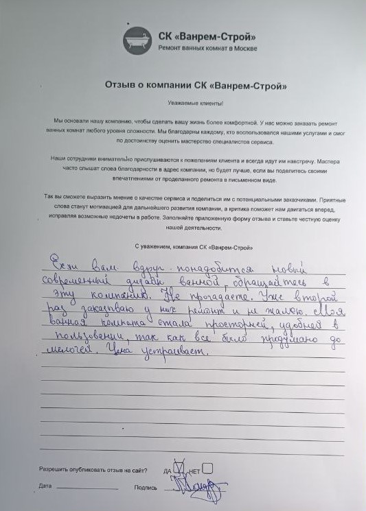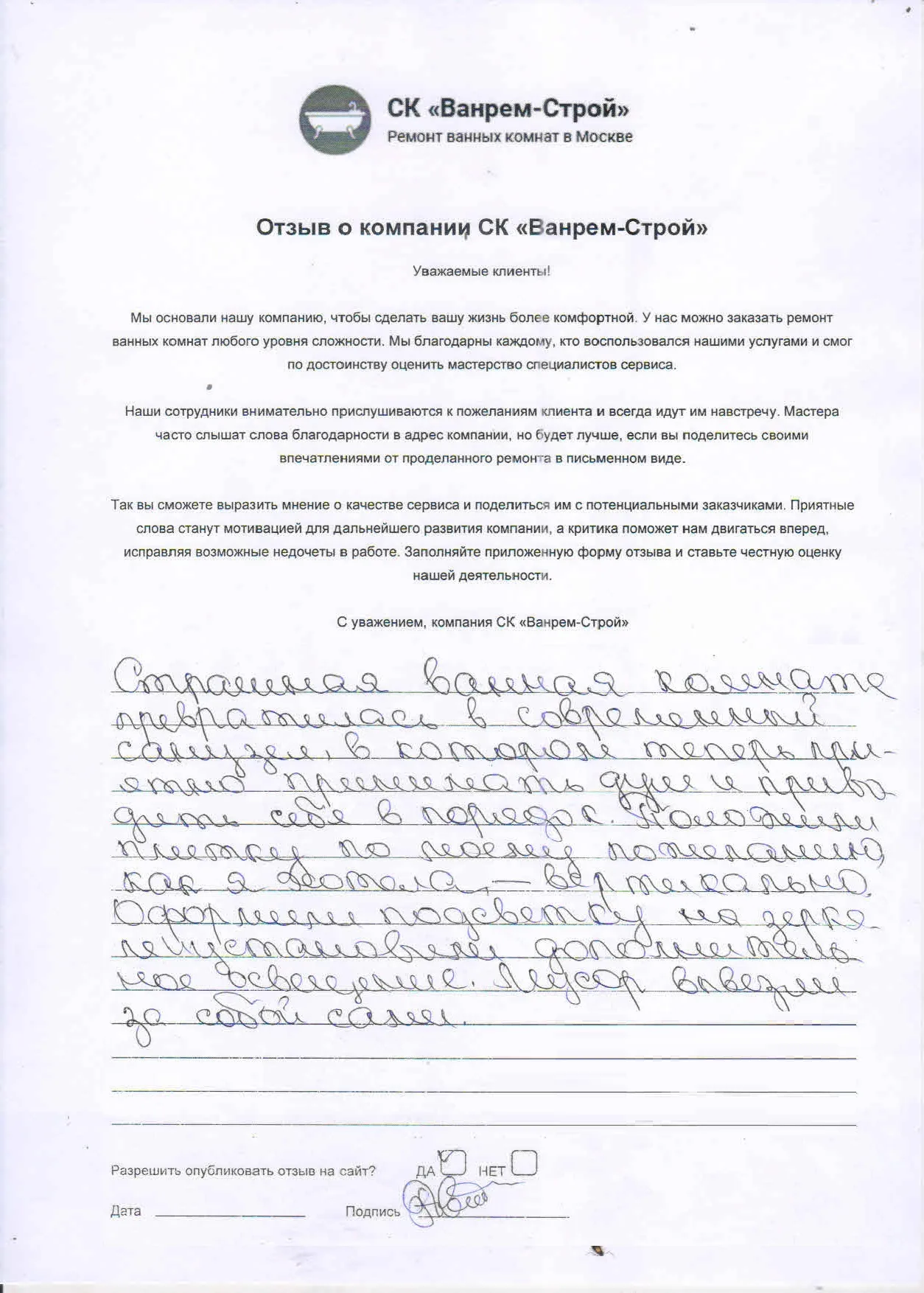 Реальные заказчики дают объективную оценку комплексной работы коллектива сотрудников СК «Ванрем-Строй». Для получения достоверной информации о качестве предоставляемых нами услуг по ремонту ванных комнат, санузлов и туалетов, изучите отзывы клиентов нашей компании.