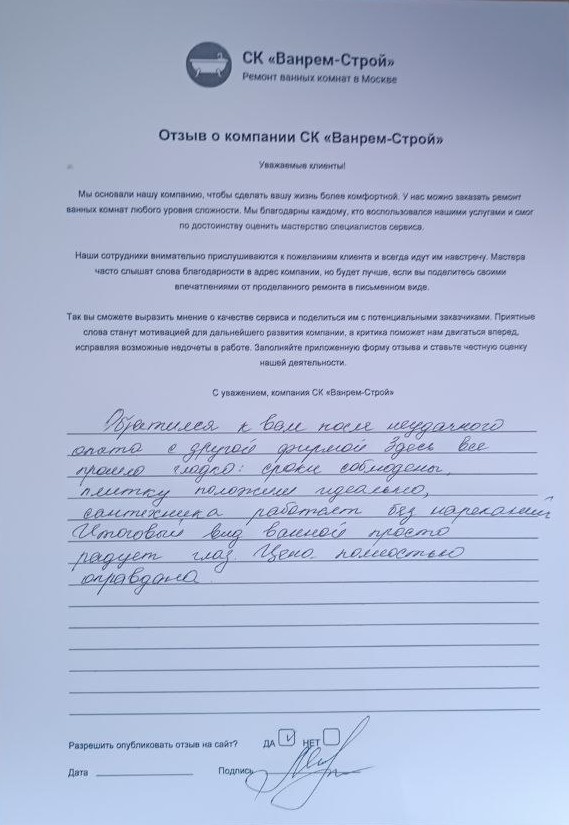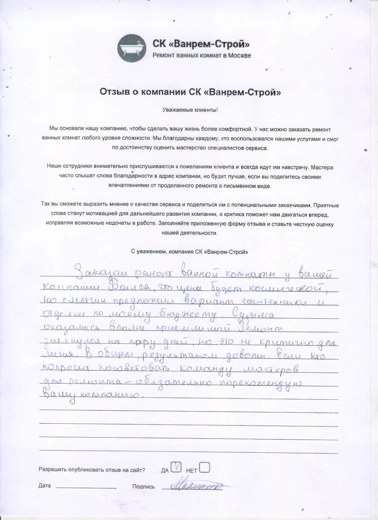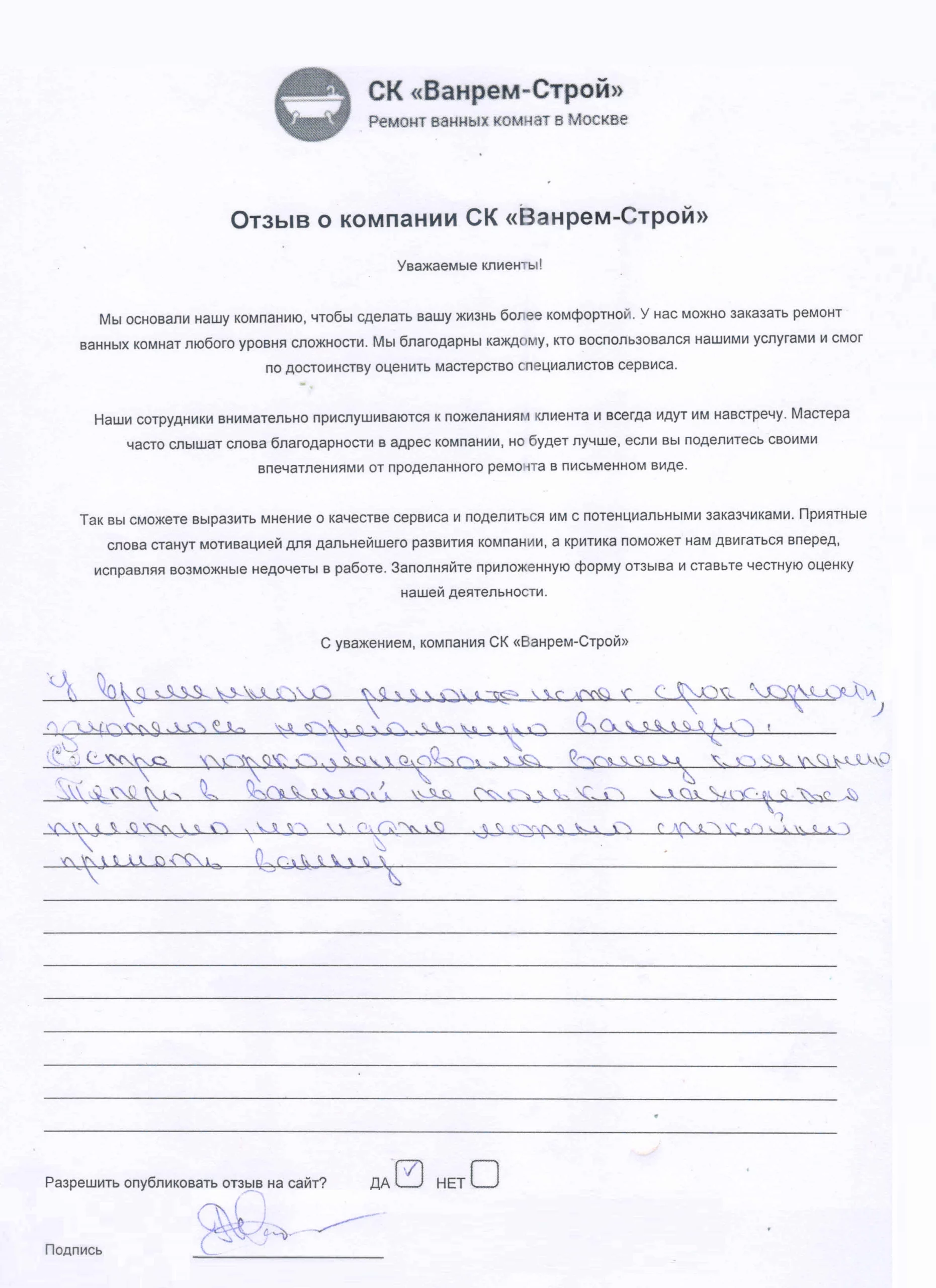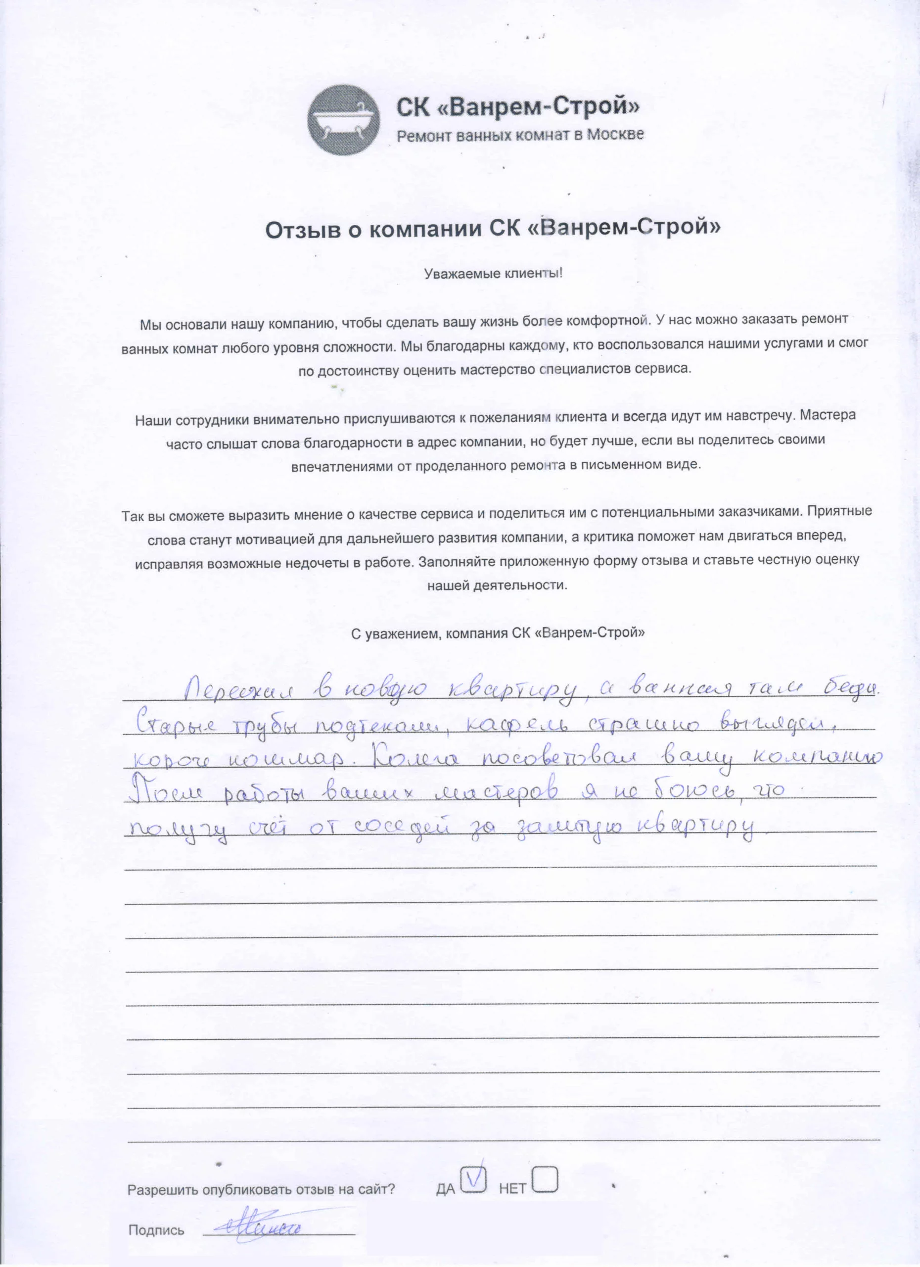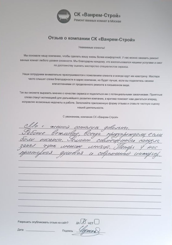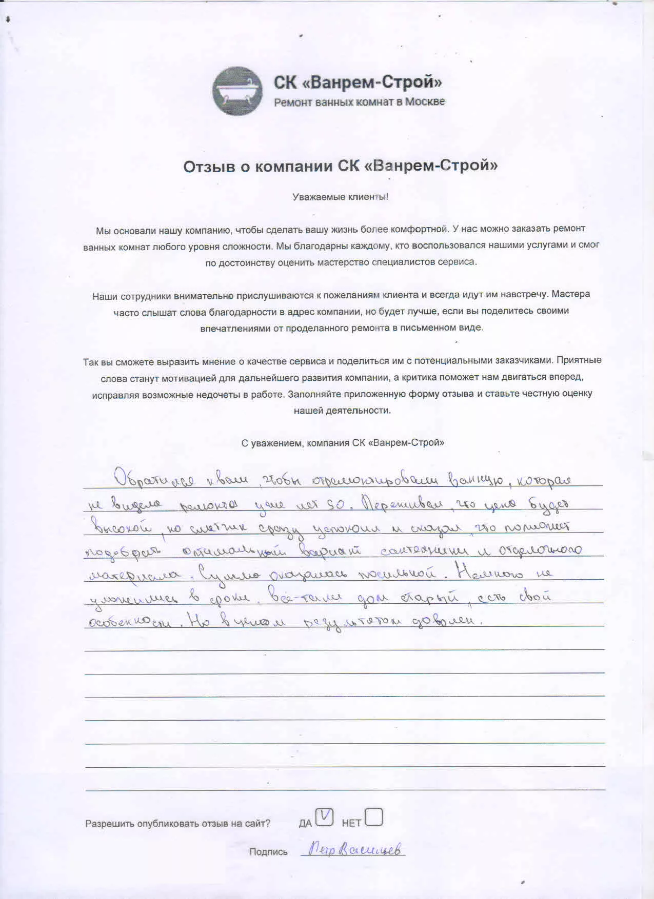 Реальные заказчики дают объективную оценку комплексной работы коллектива сотрудников СК «Ванрем-Строй». Для получения достоверной информации о качестве предоставляемых нами услуг по ремонту ванных комнат, санузлов и туалетов, изучите отзывы клиентов нашей компании.