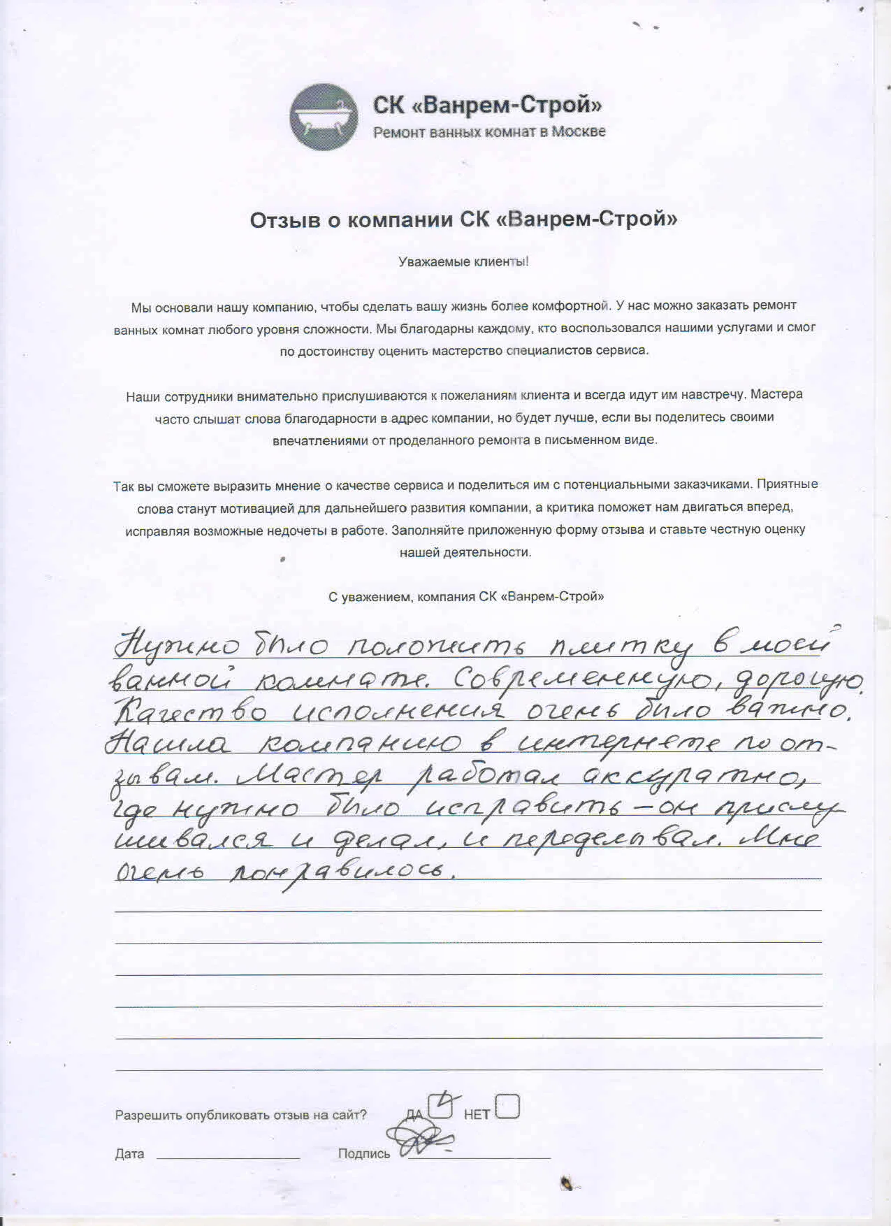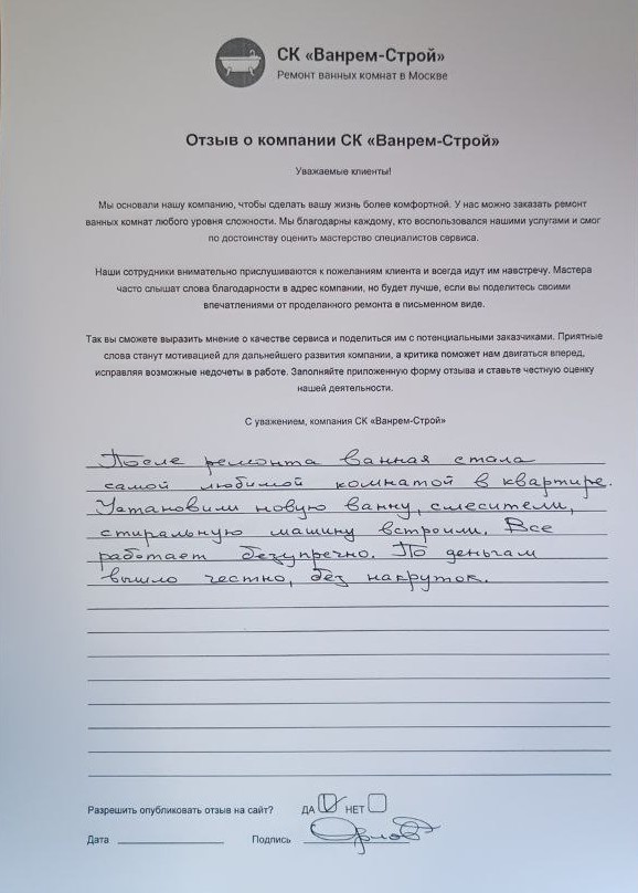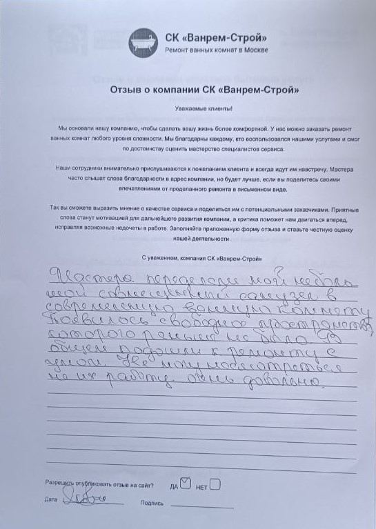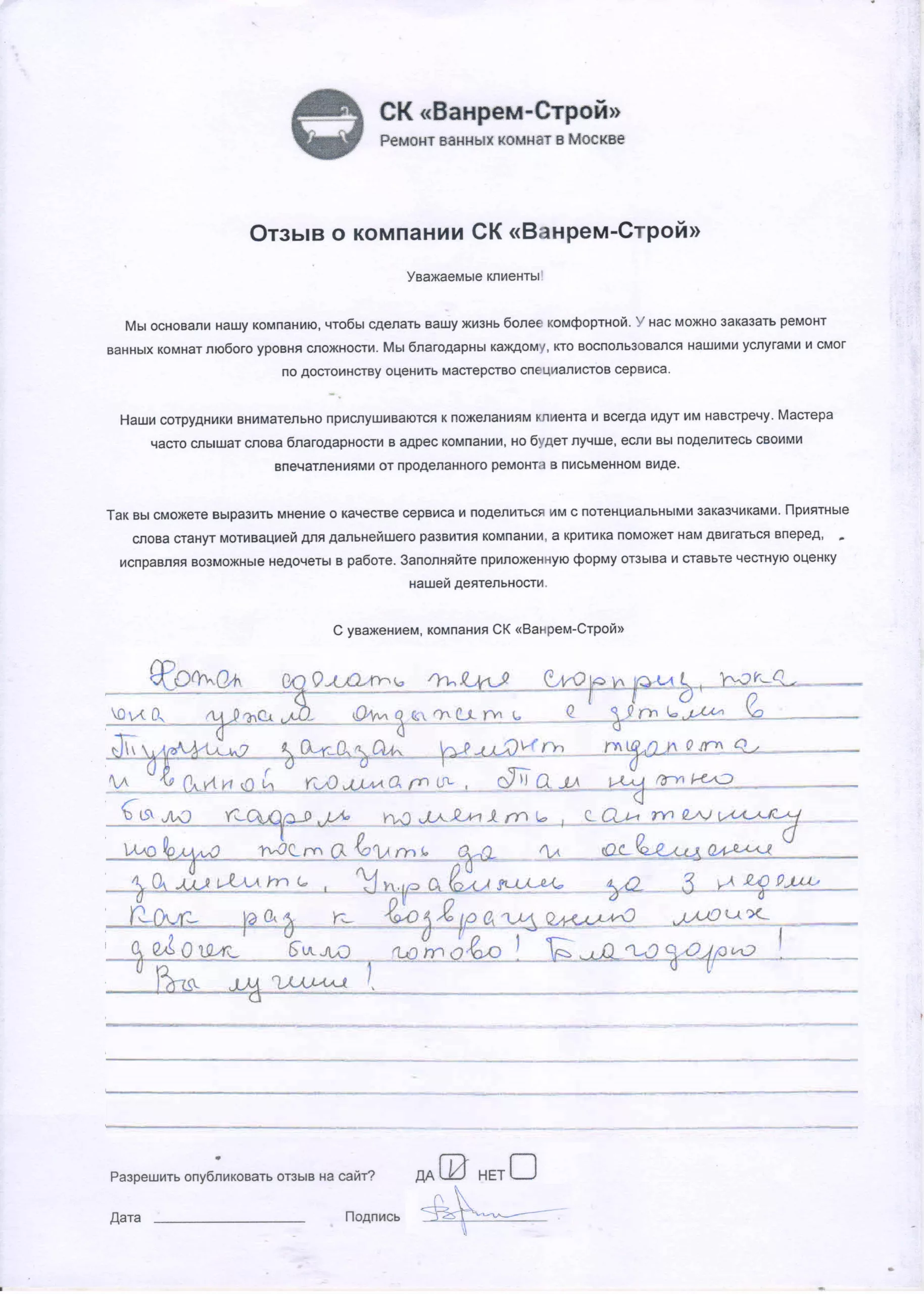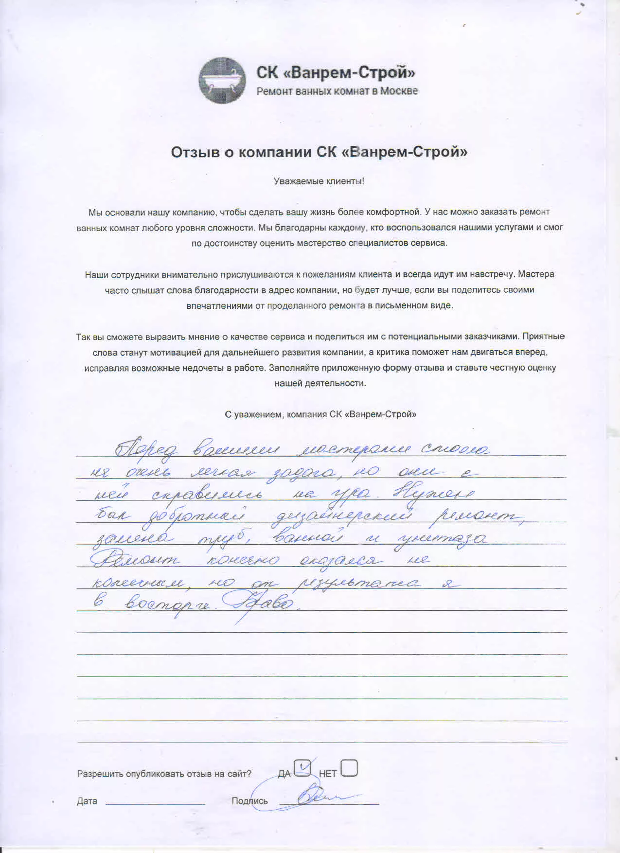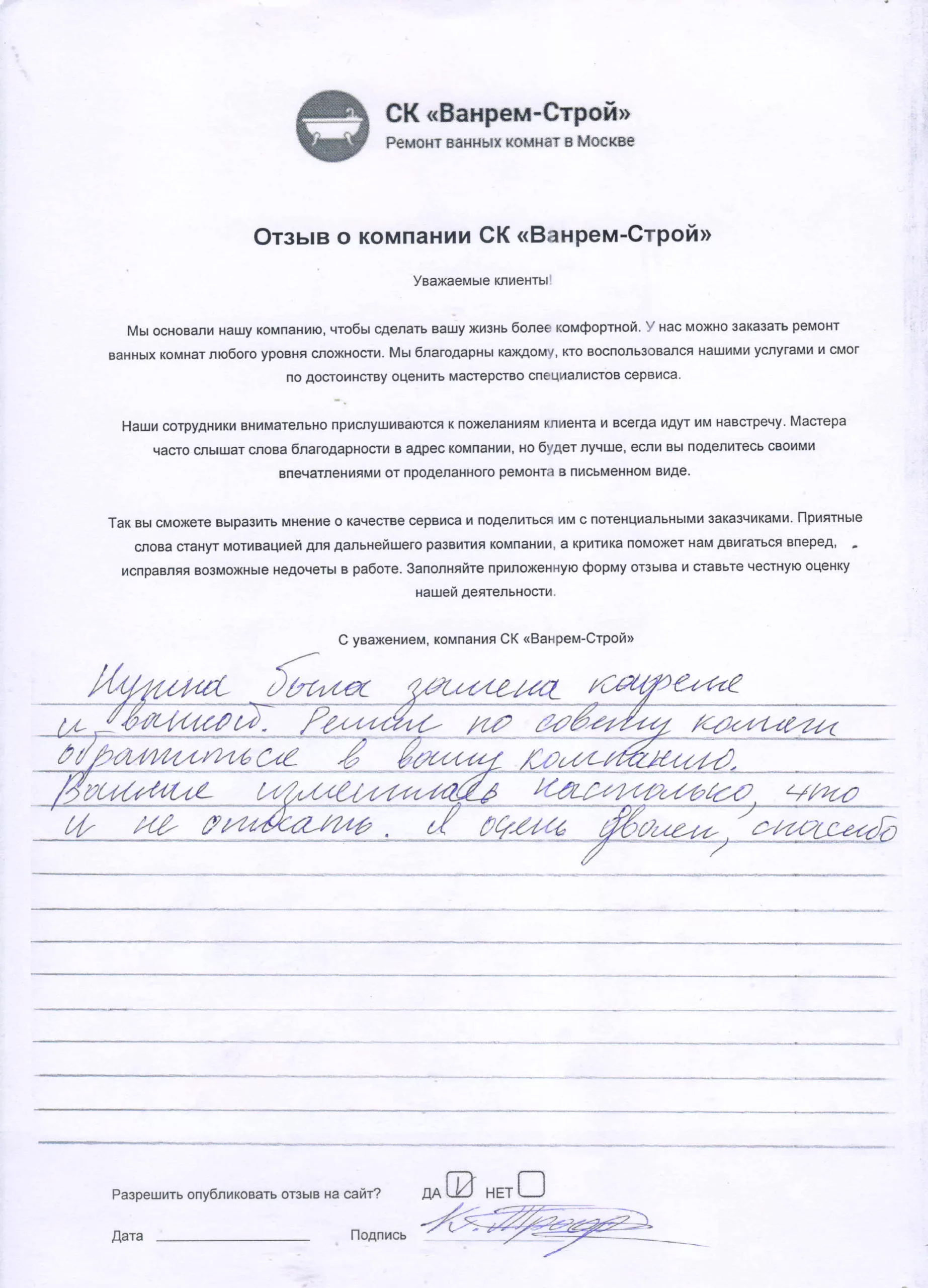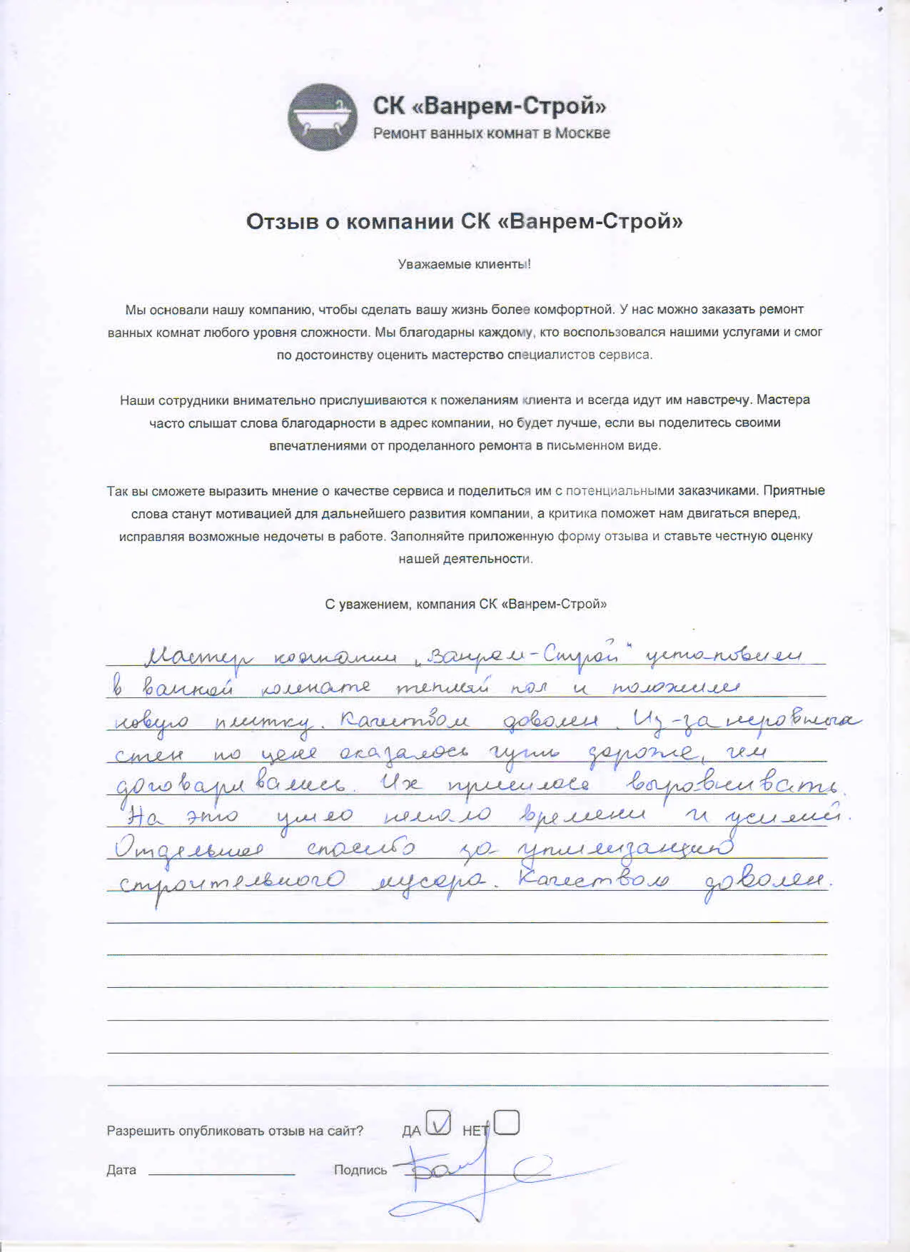 Реальные заказчики дают объективную оценку комплексной работы коллектива сотрудников СК «Ванрем-Строй». Для получения достоверной информации о качестве предоставляемых нами услуг по ремонту ванных комнат, санузлов и туалетов, изучите отзывы клиентов нашей компании.