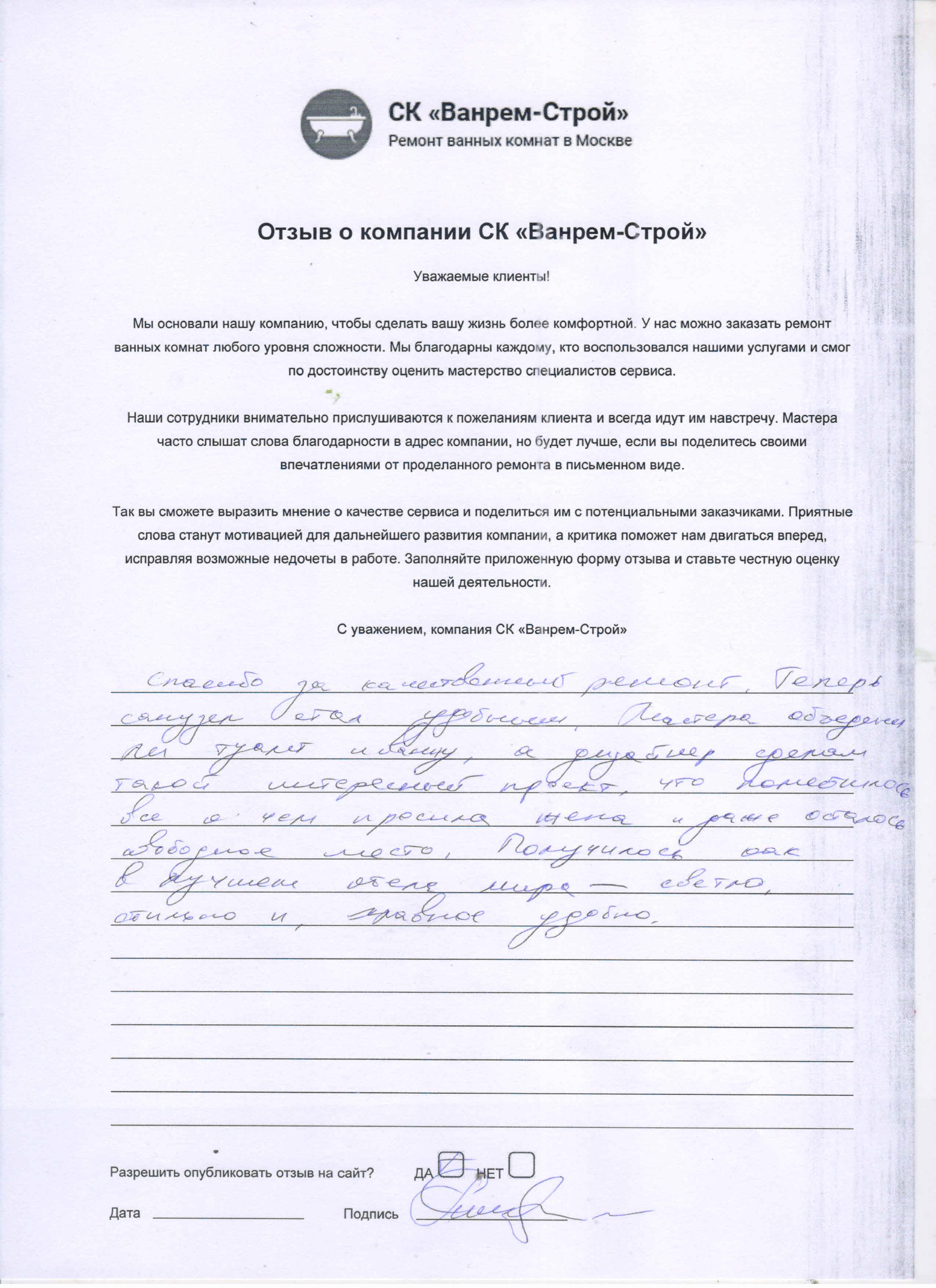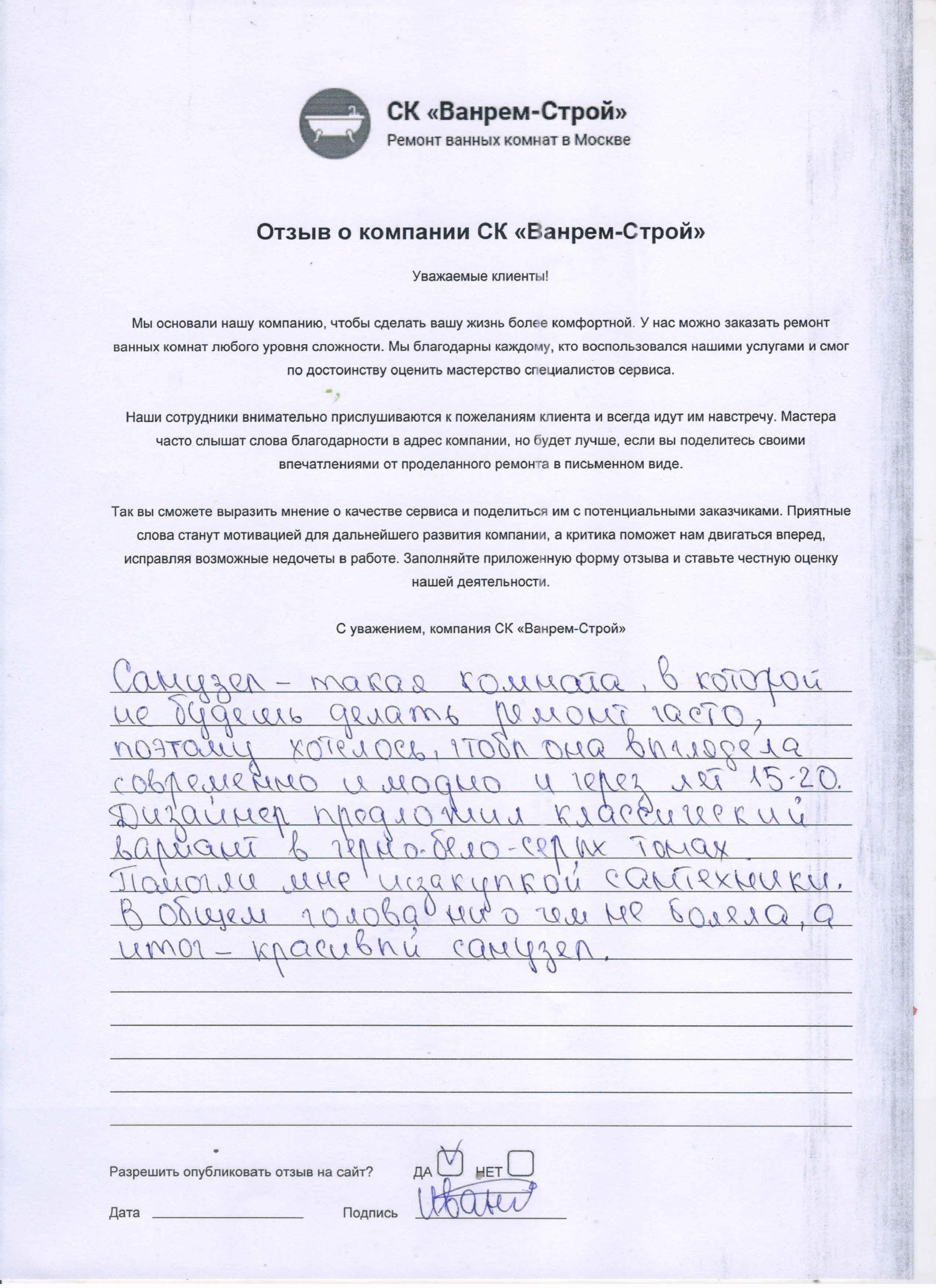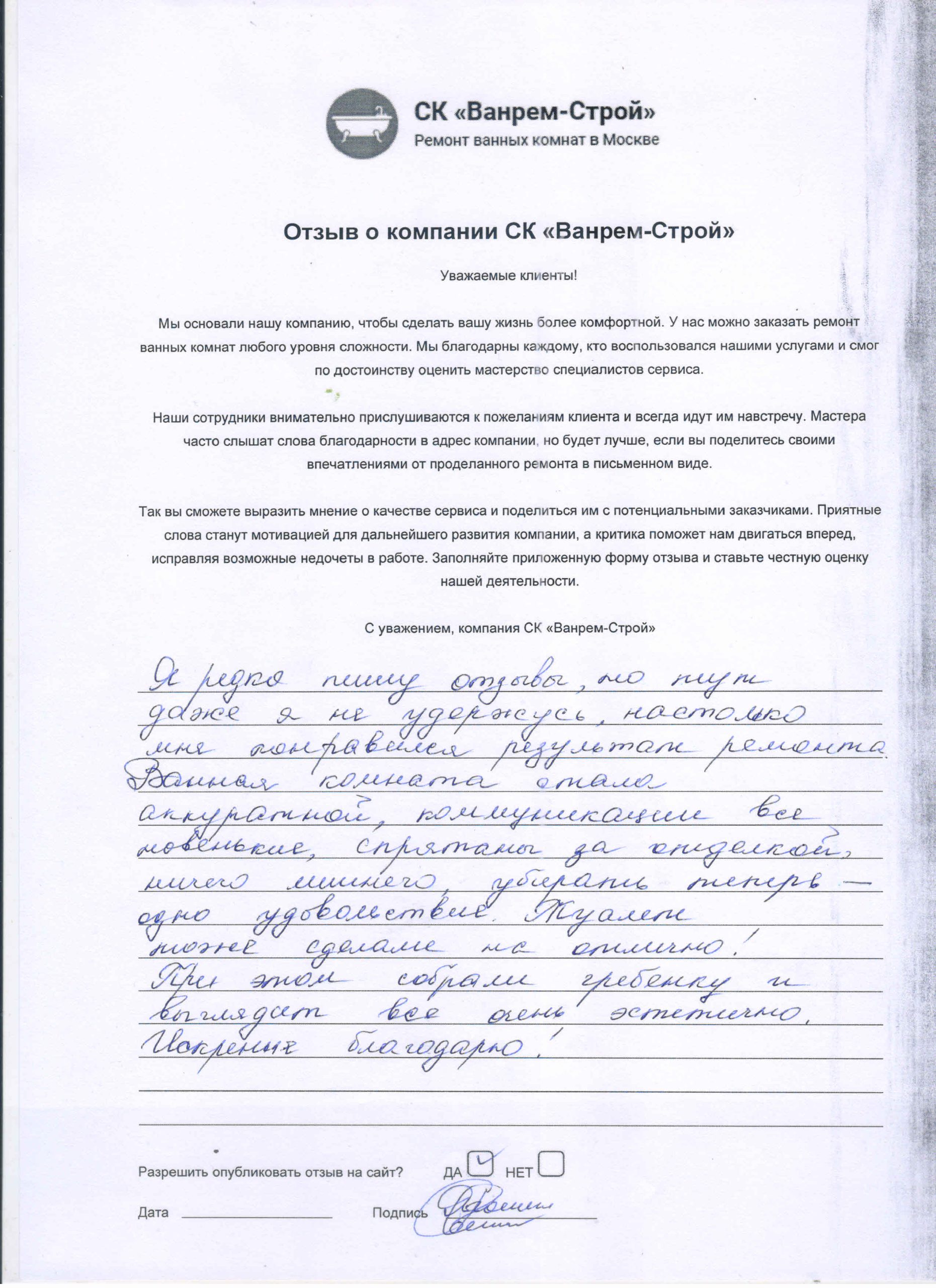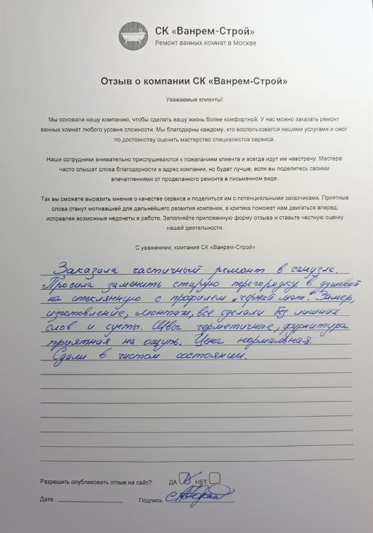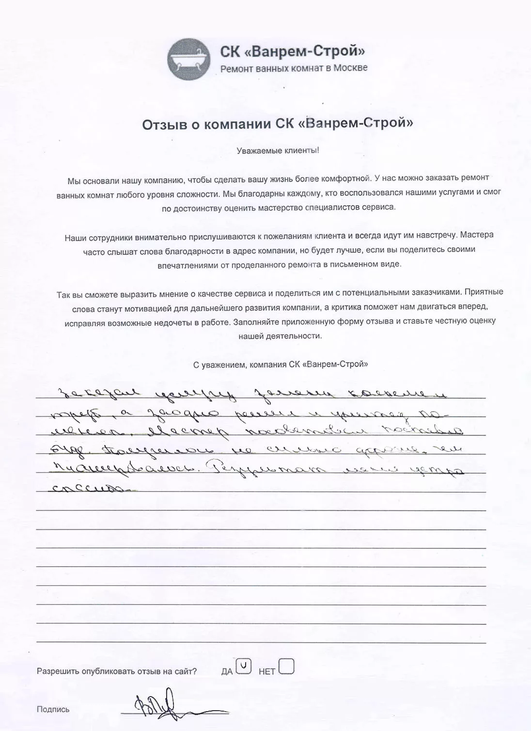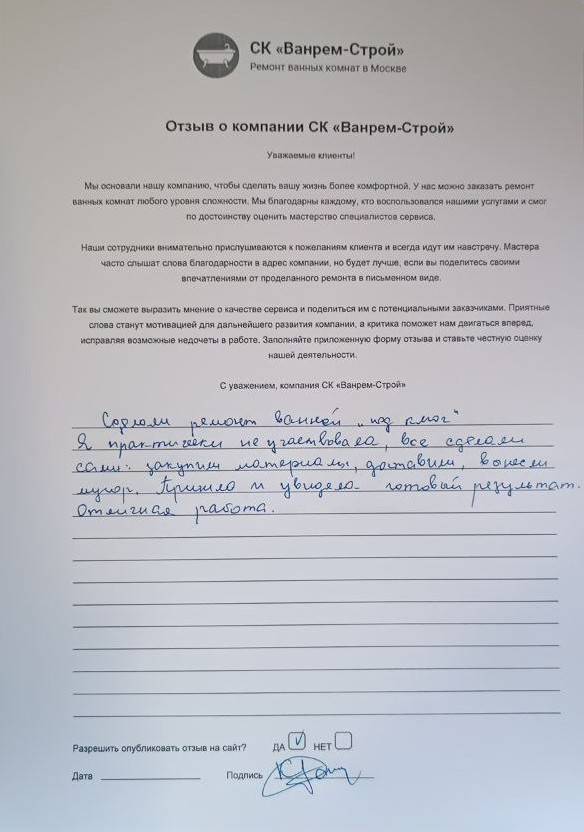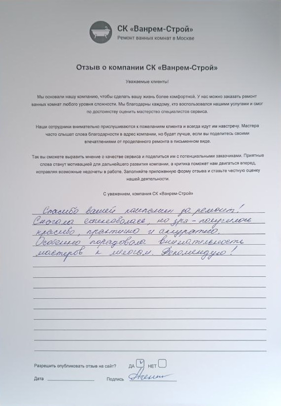 Реальные заказчики дают объективную оценку комплексной работы коллектива сотрудников СК «Ванрем-Строй». Для получения достоверной информации о качестве предоставляемых нами услуг по ремонту ванных комнат, санузлов и туалетов, изучите отзывы клиентов нашей компании.