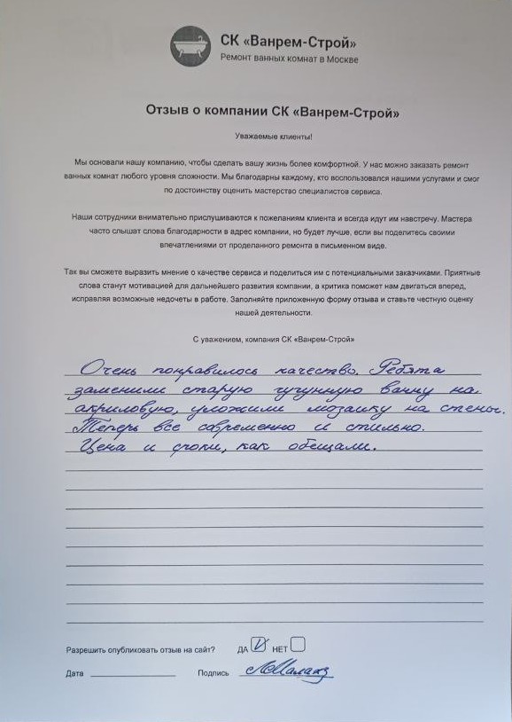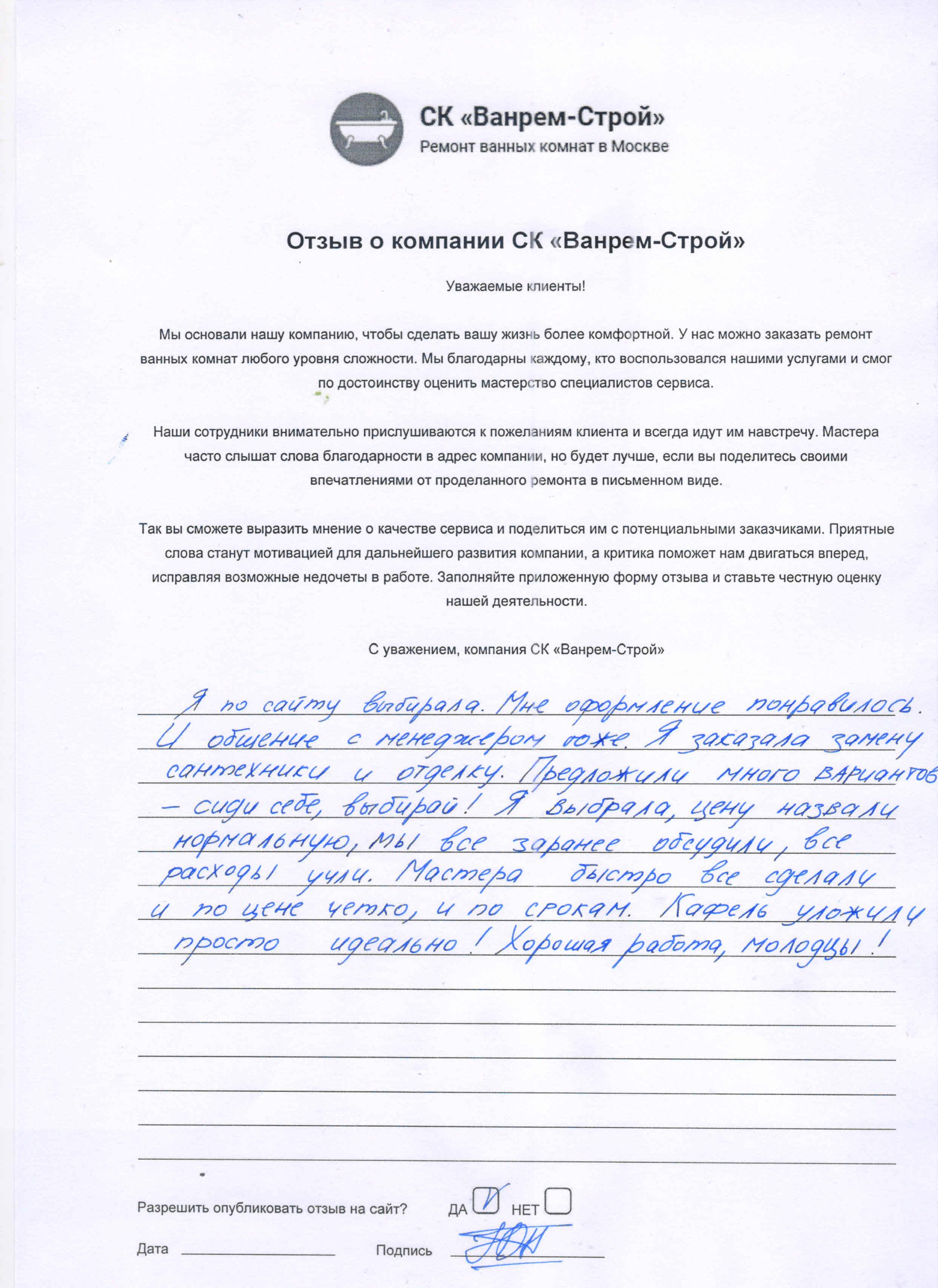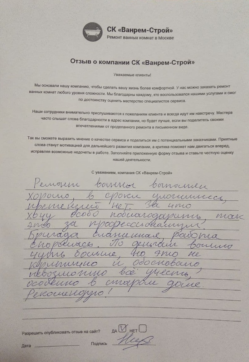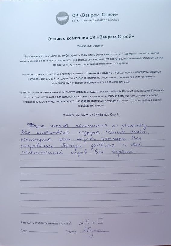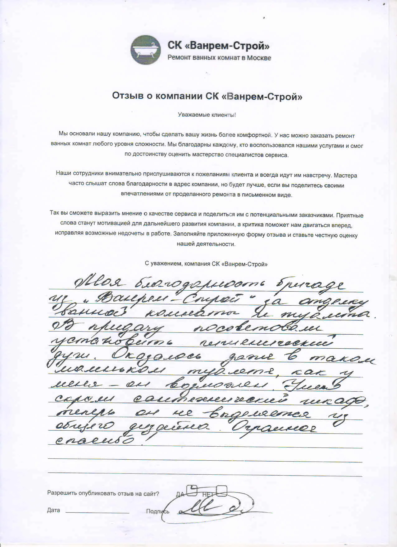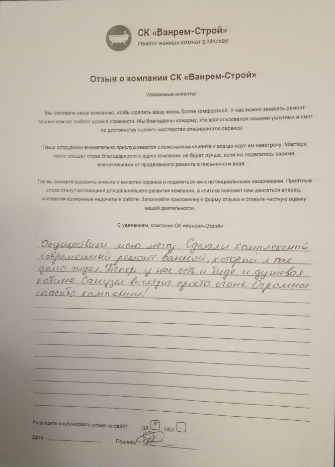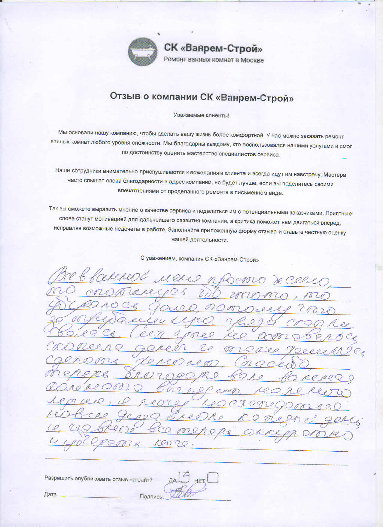 Реальные заказчики дают объективную оценку комплексной работы коллектива сотрудников СК «Ванрем-Строй». Для получения достоверной информации о качестве предоставляемых нами услуг по ремонту ванных комнат, санузлов и туалетов, изучите отзывы клиентов нашей компании.
