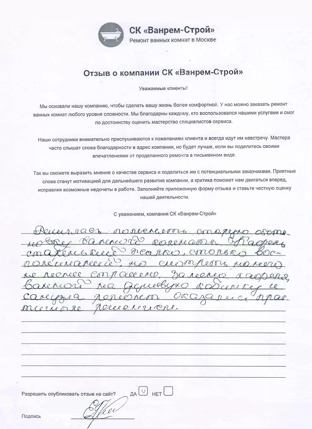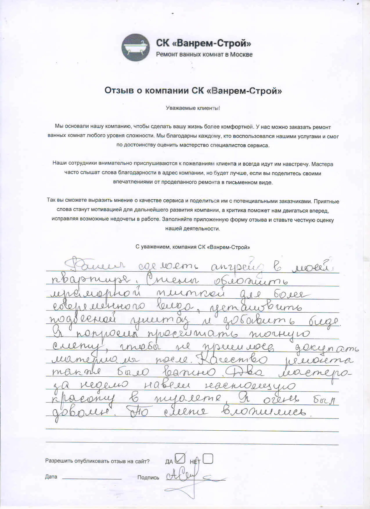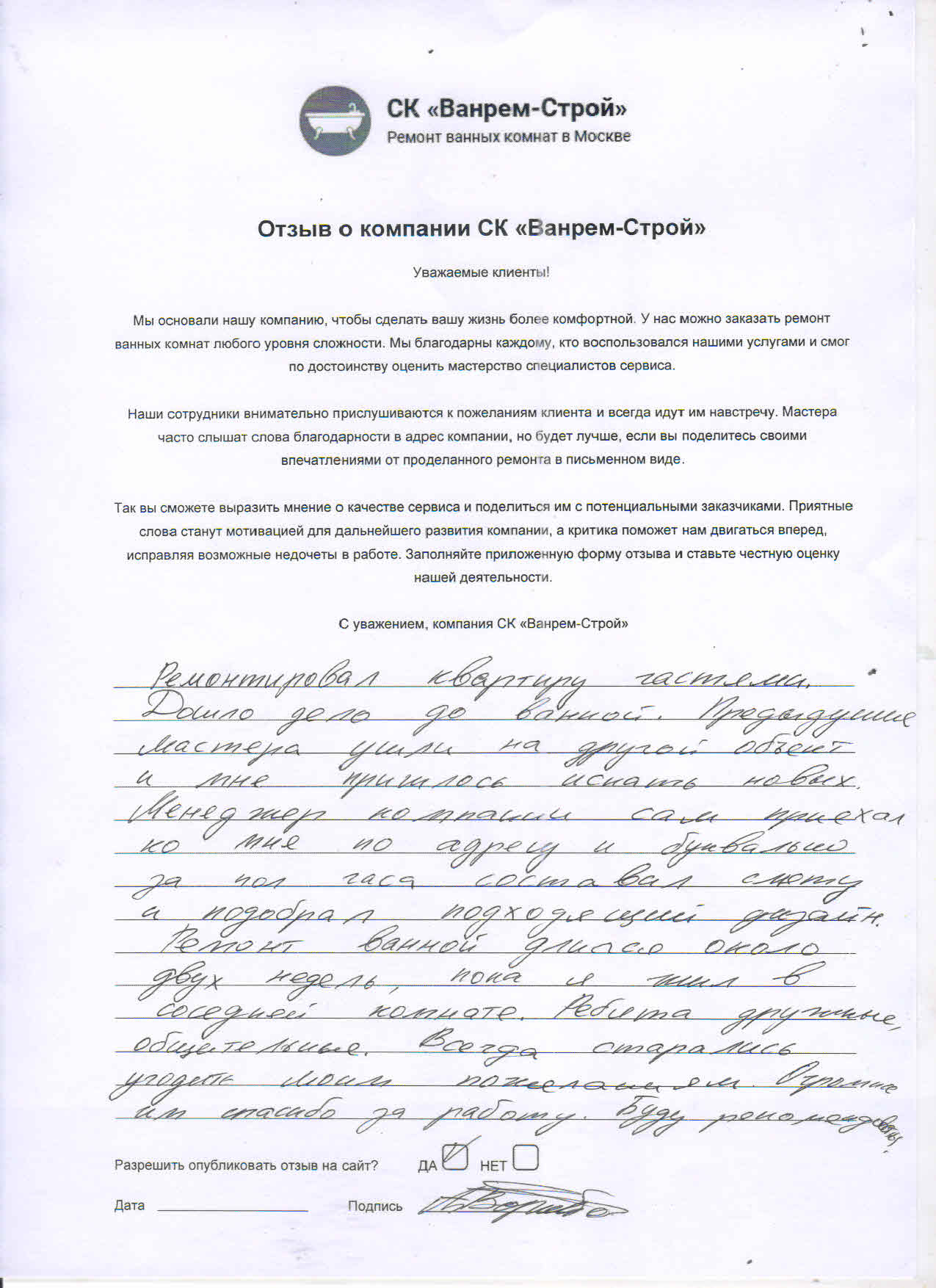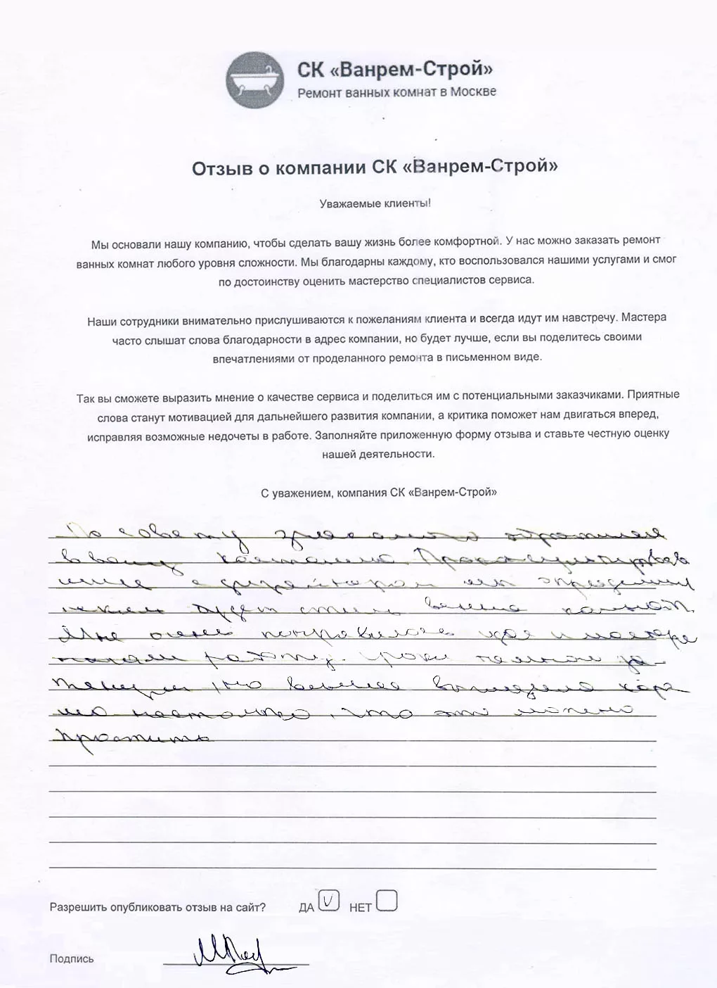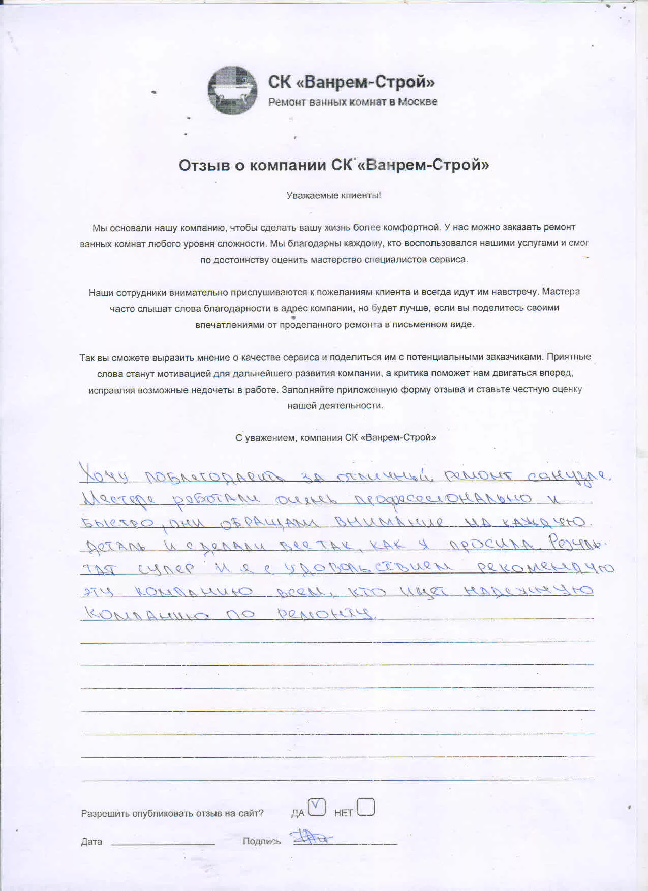 Реальные заказчики дают объективную оценку комплексной работы коллектива сотрудников СК «Ванрем-Строй». Для получения достоверной информации о качестве предоставляемых нами услуг по ремонту ванных комнат, санузлов и туалетов, изучите отзывы клиентов нашей компании.