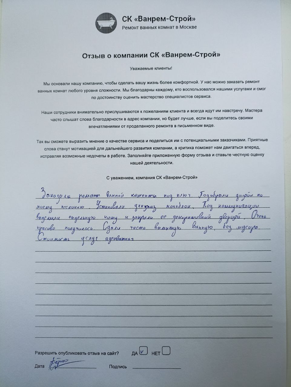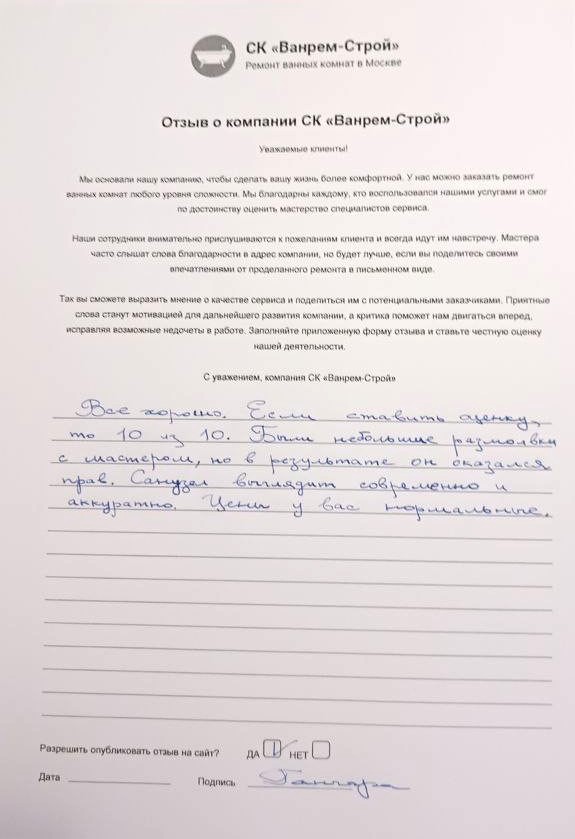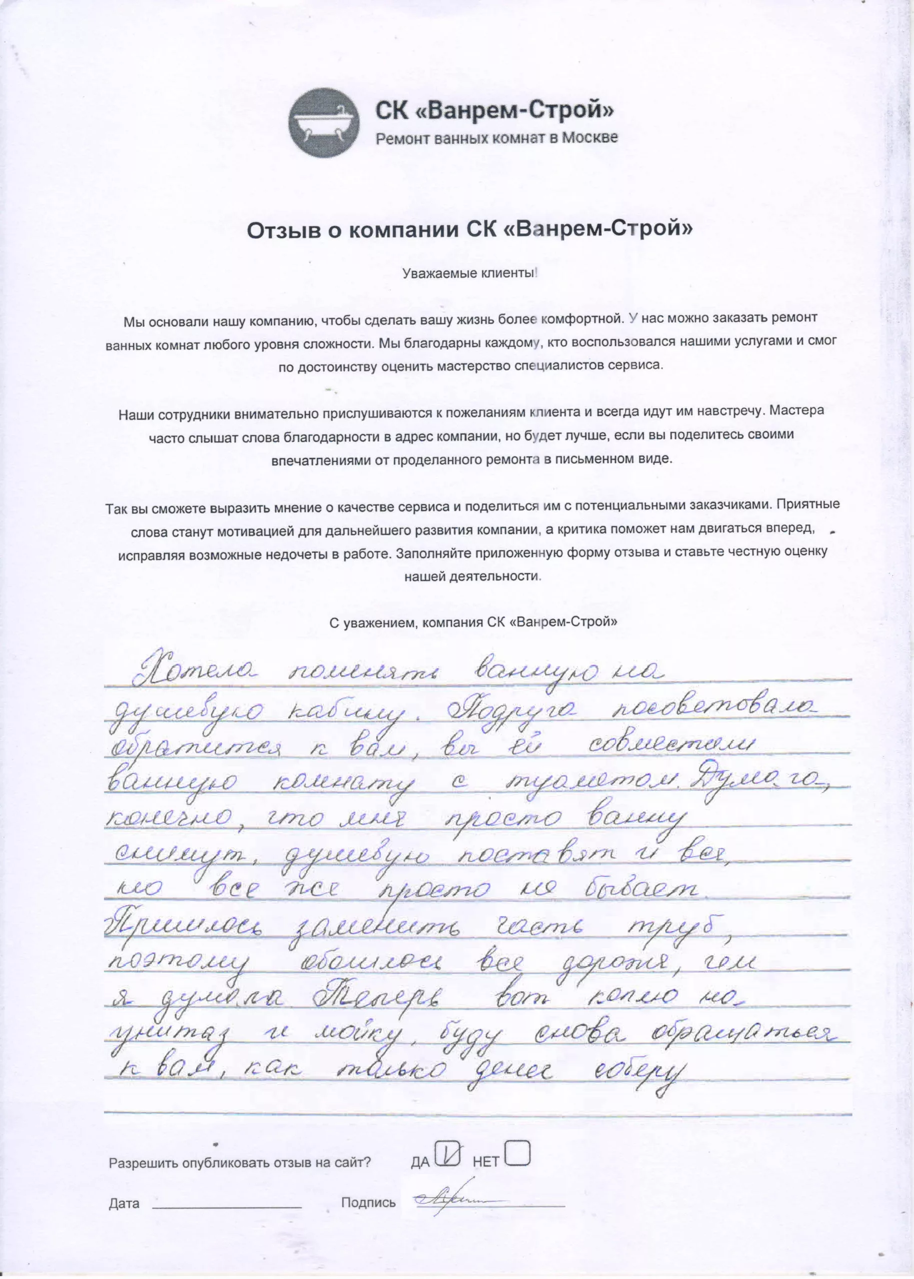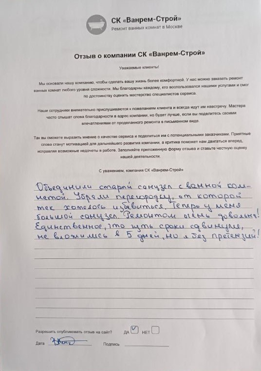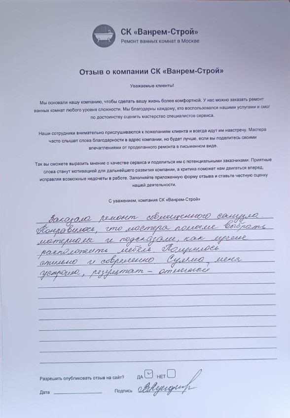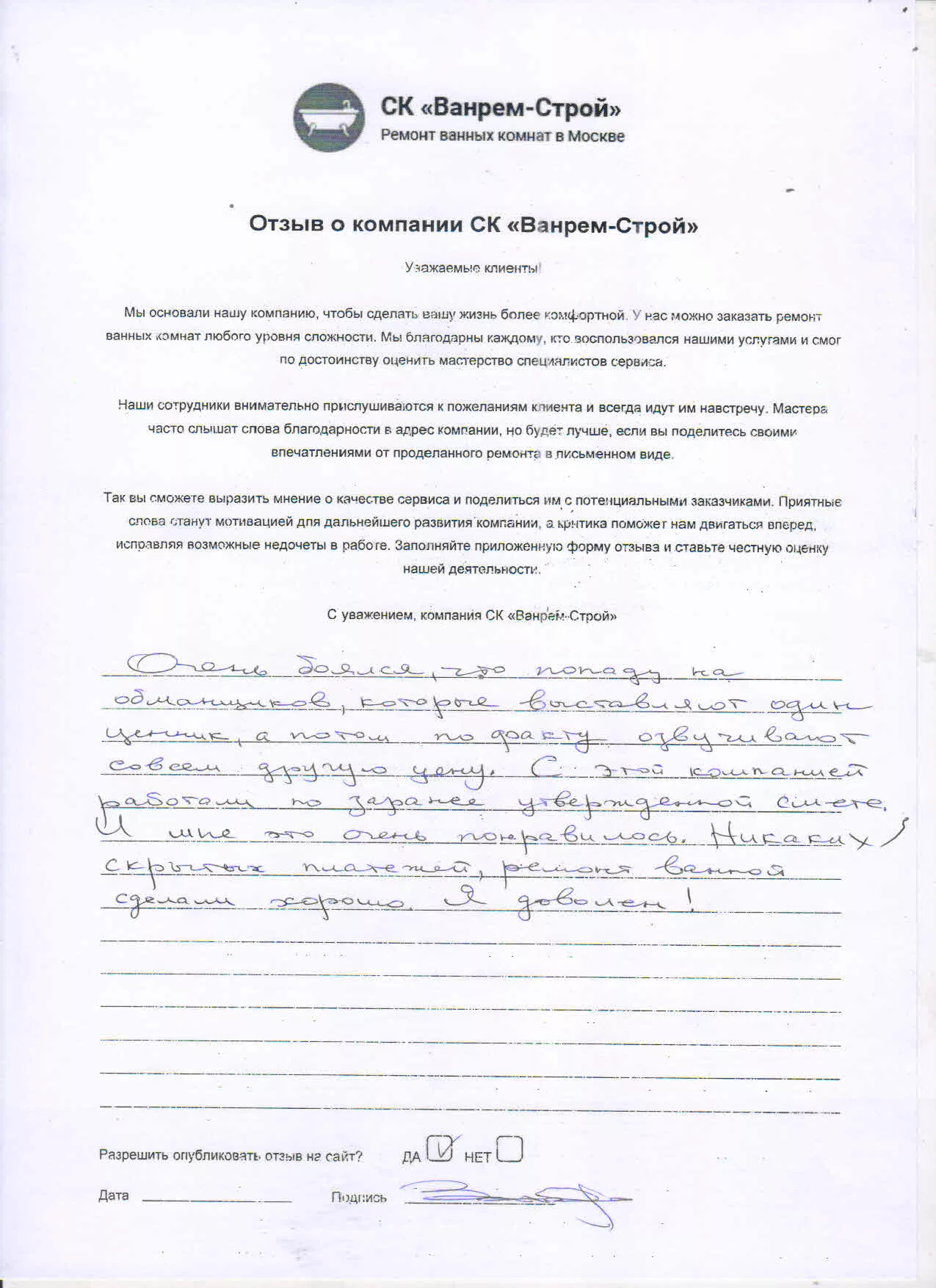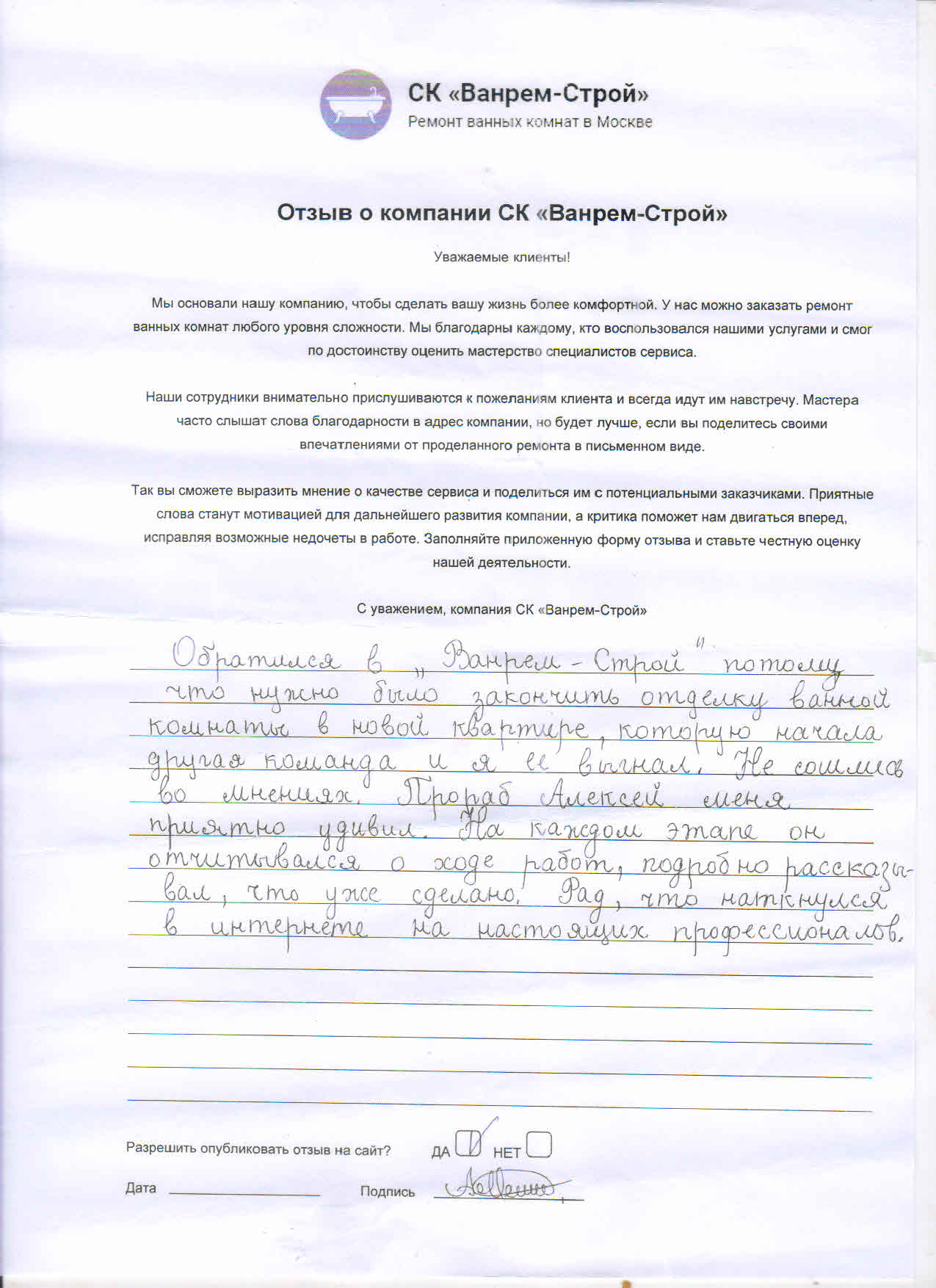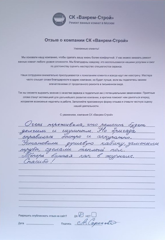 Реальные заказчики дают объективную оценку комплексной работы коллектива сотрудников СК «Ванрем-Строй». Для получения достоверной информации о качестве предоставляемых нами услуг по ремонту ванных комнат, санузлов и туалетов, изучите отзывы клиентов нашей компании.