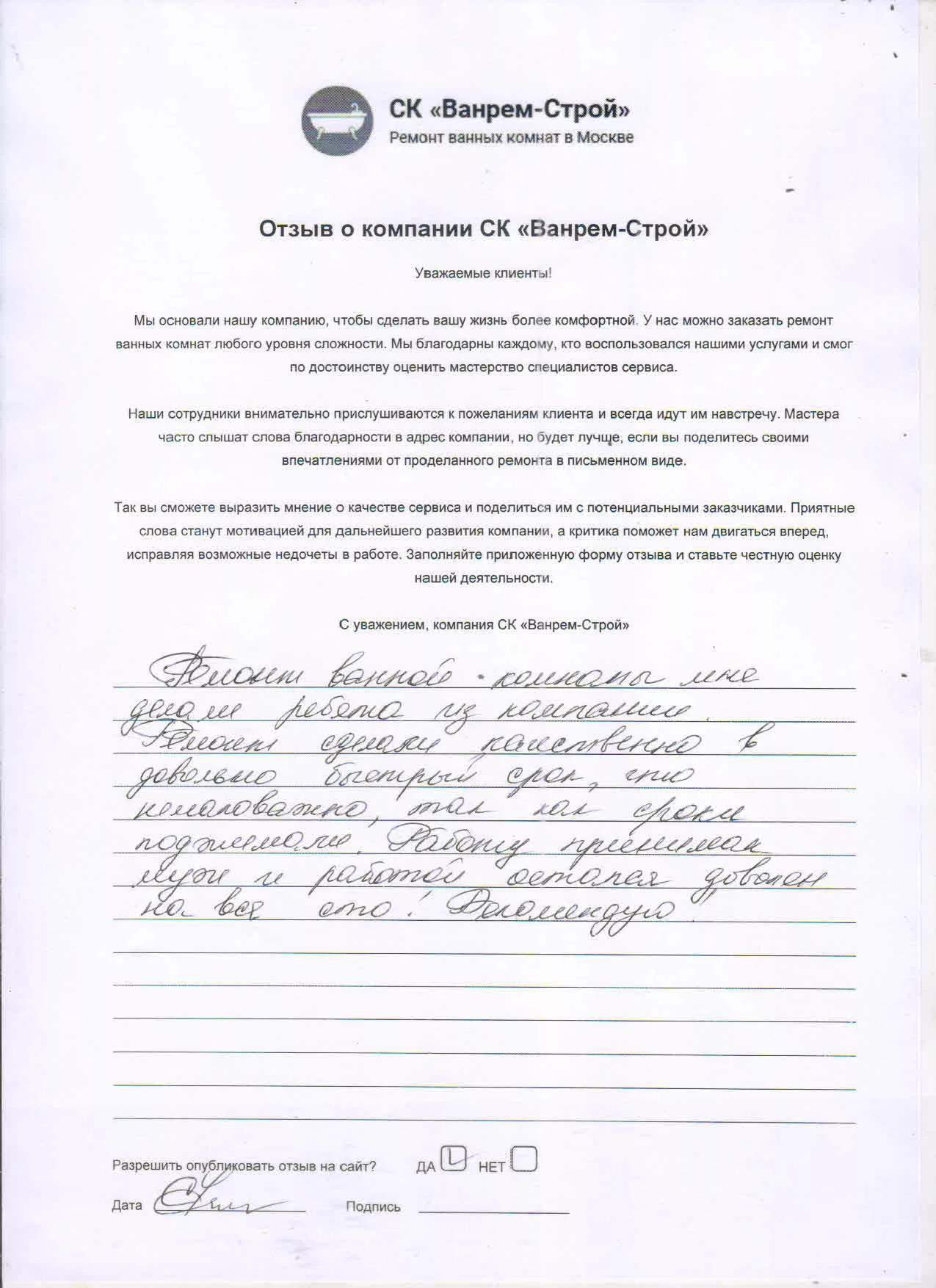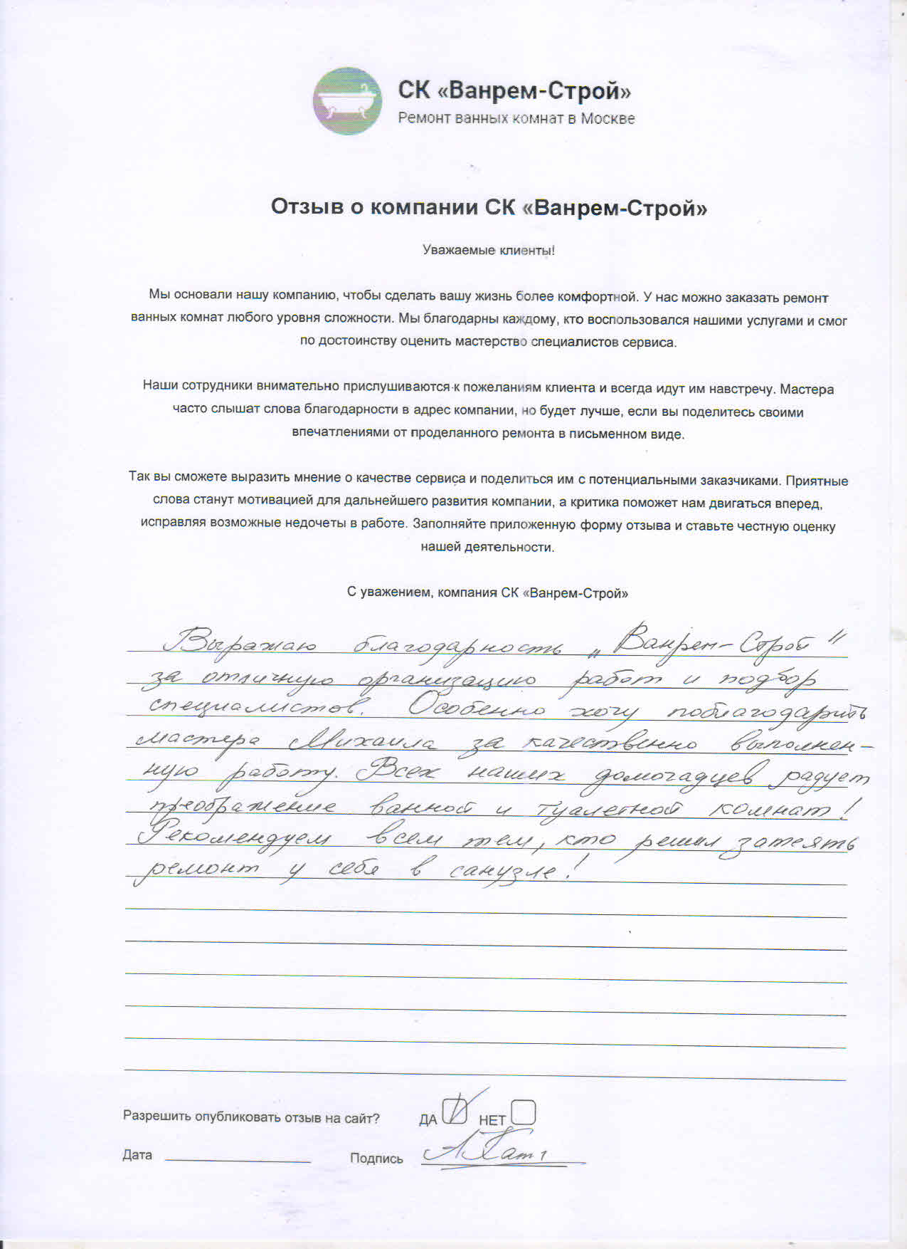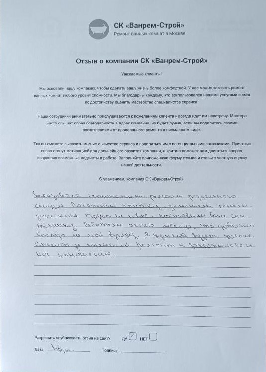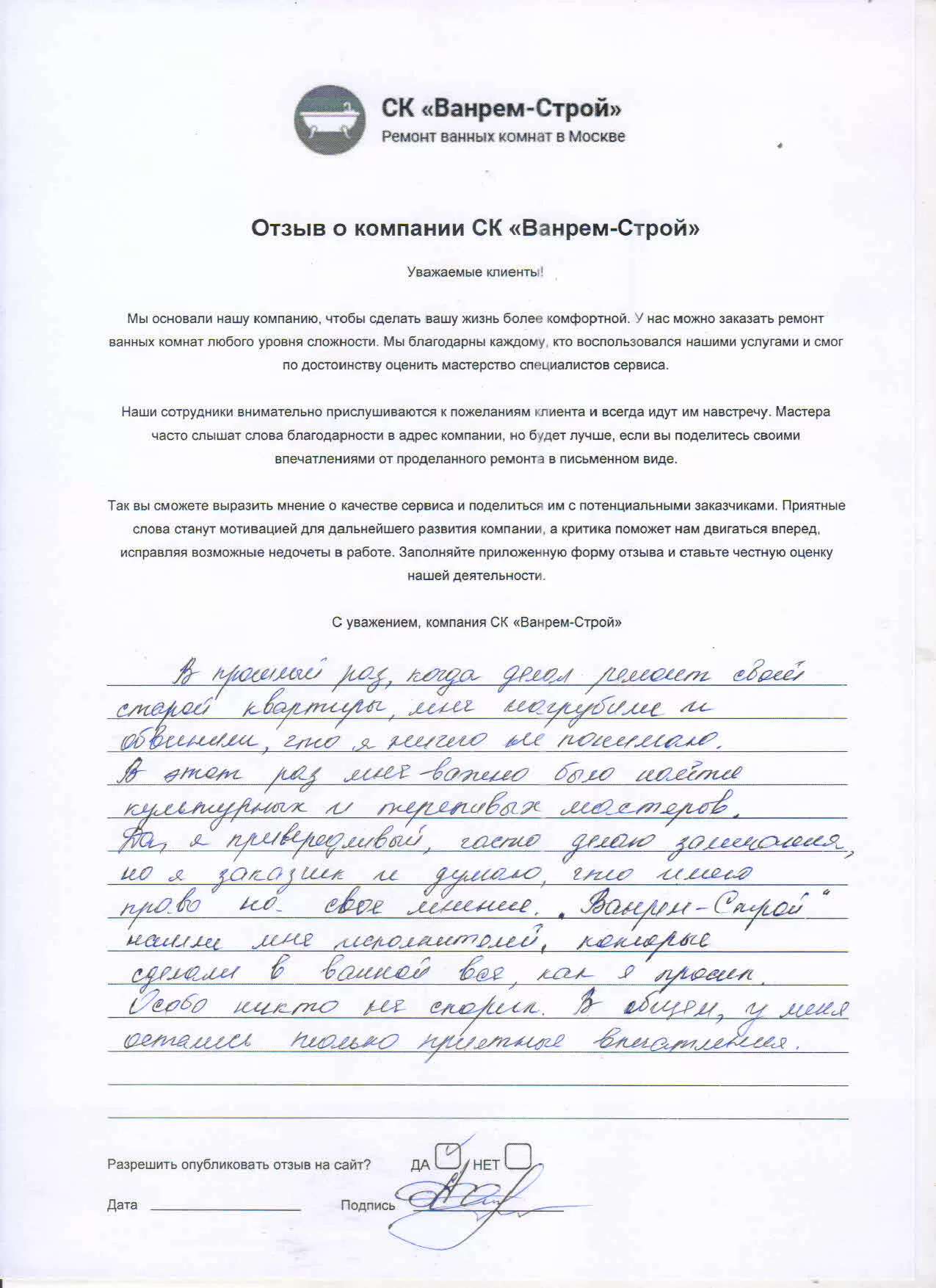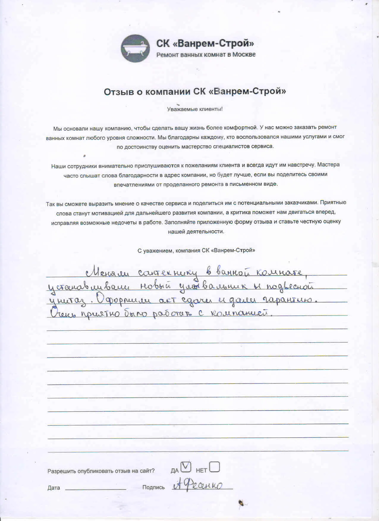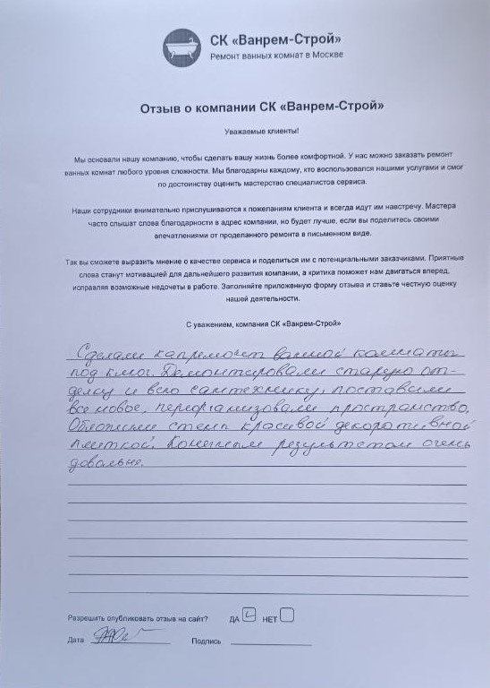 Реальные заказчики дают объективную оценку комплексной работы коллектива сотрудников СК «Ванрем-Строй». Для получения достоверной информации о качестве предоставляемых нами услуг по ремонту ванных комнат, санузлов и туалетов, изучите отзывы клиентов нашей компании.
