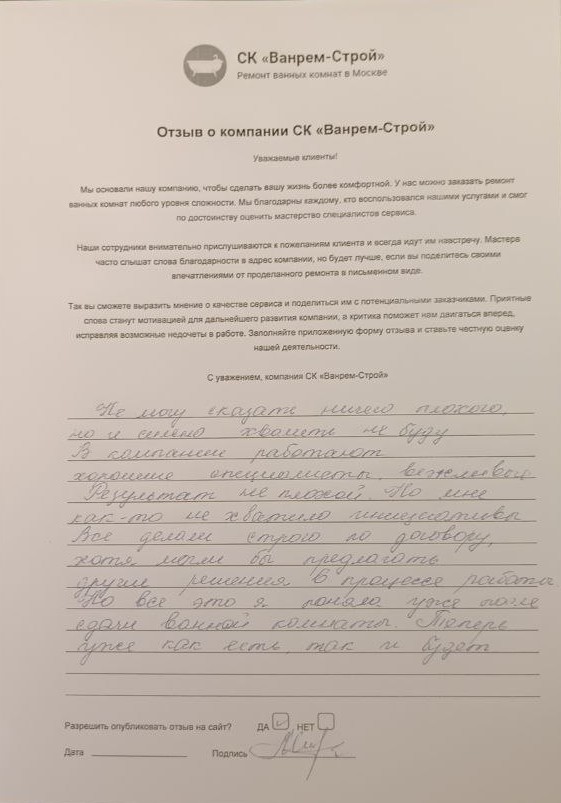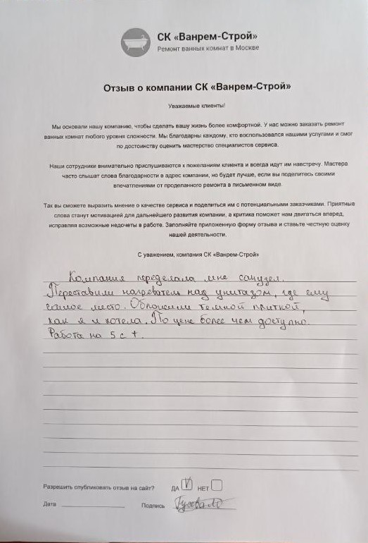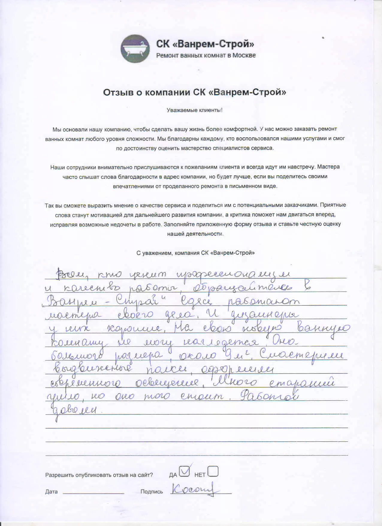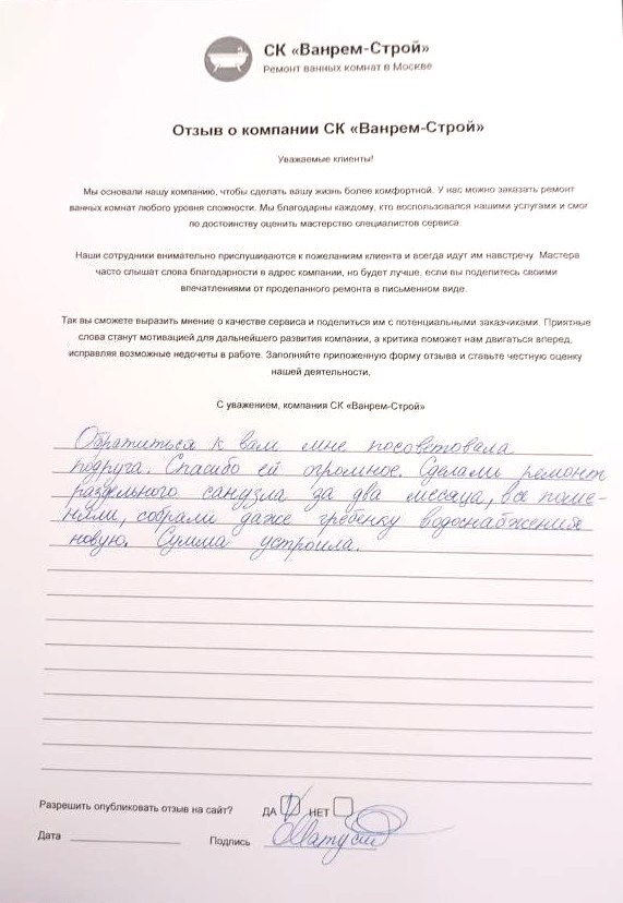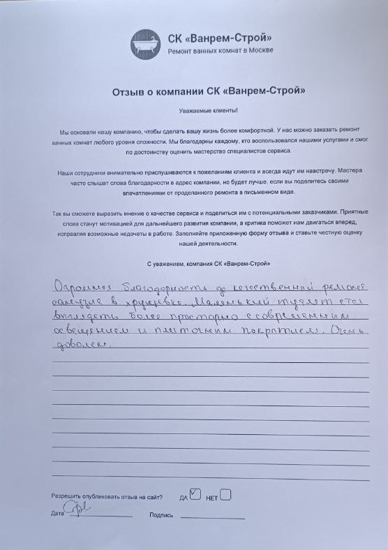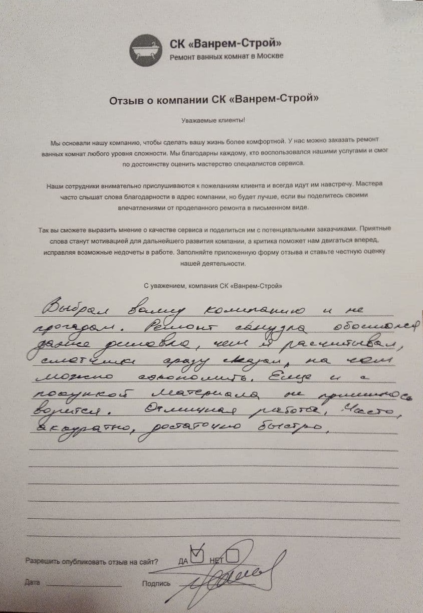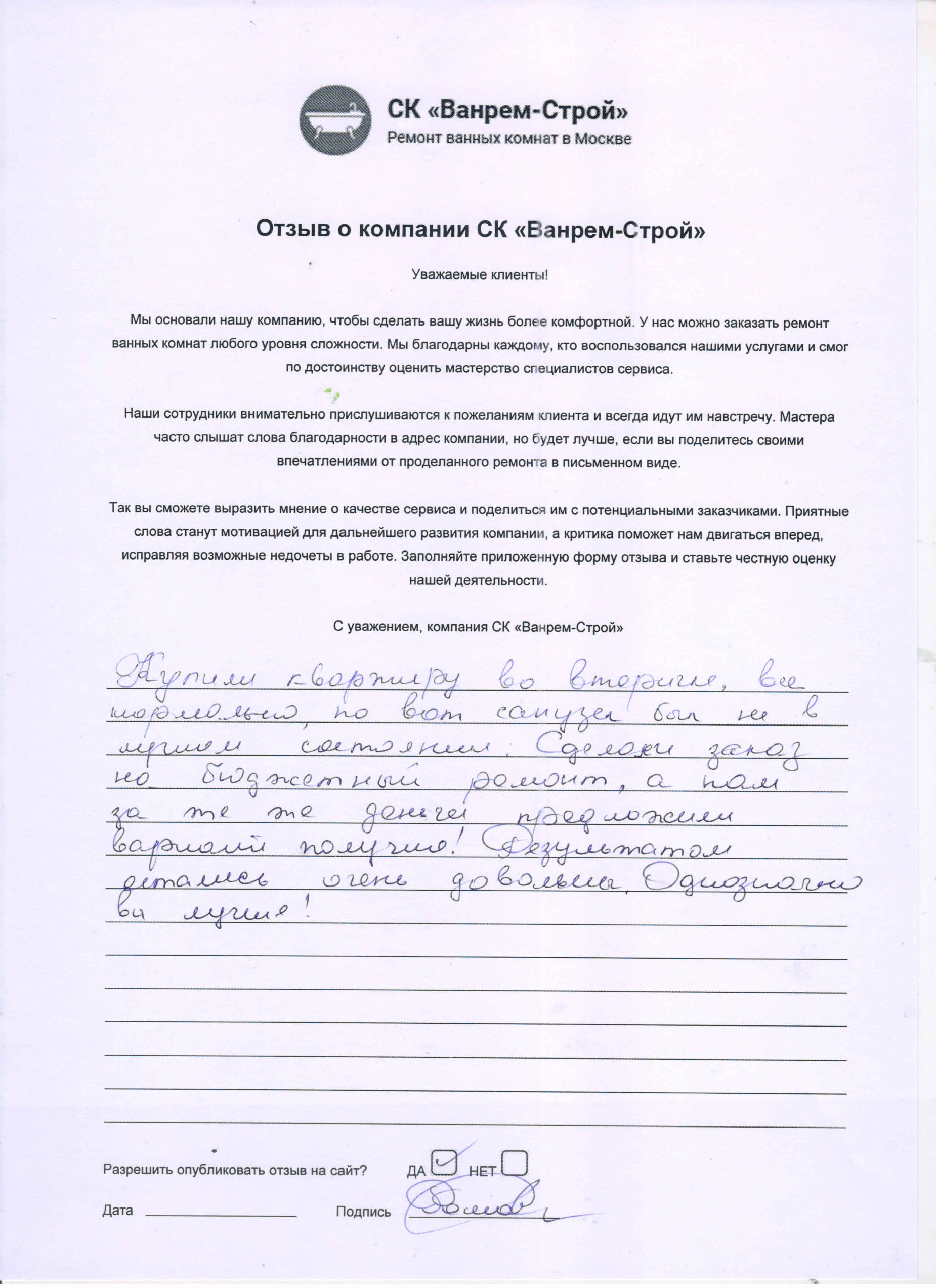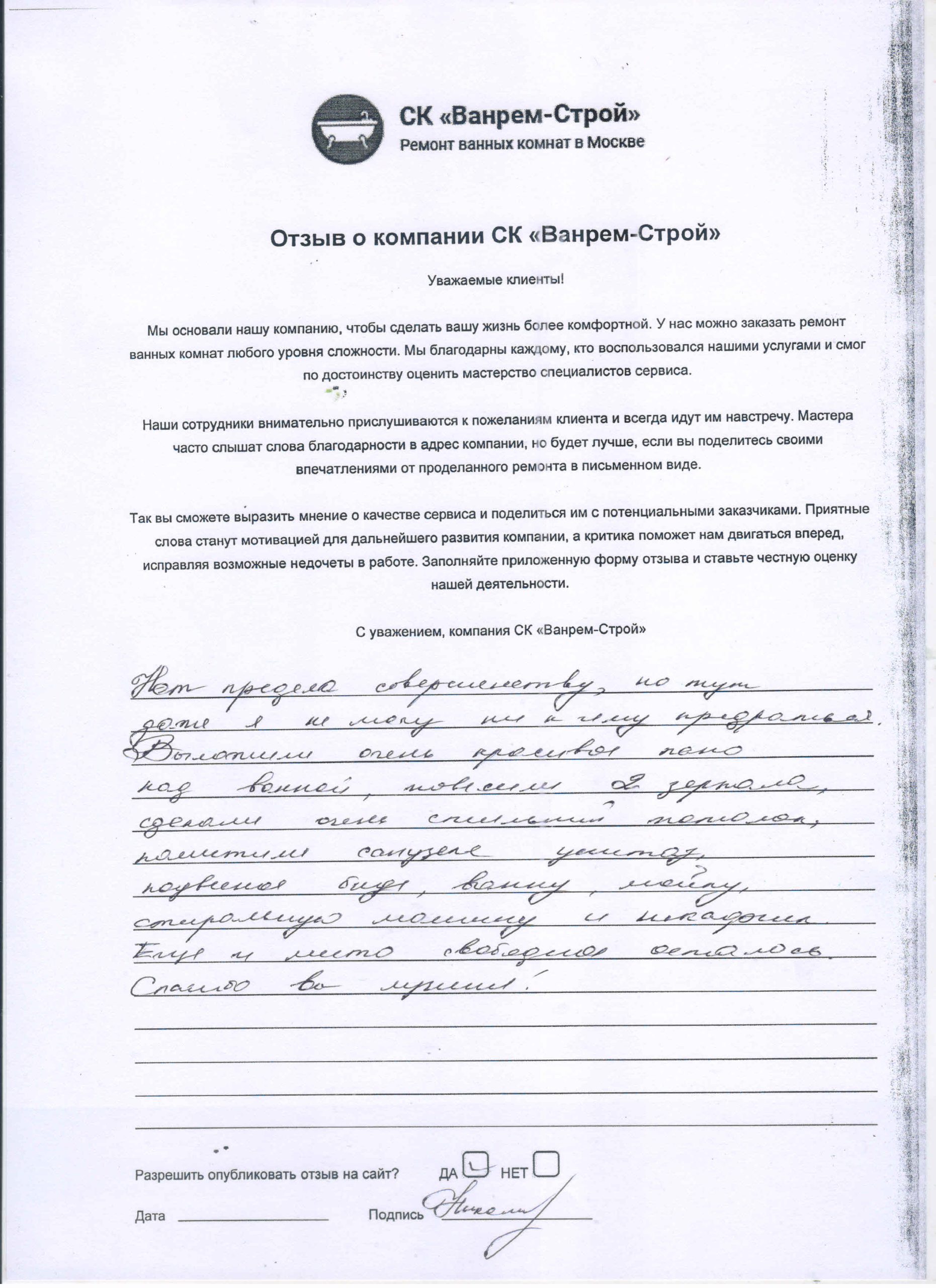 Реальные заказчики дают объективную оценку комплексной работы коллектива сотрудников СК «Ванрем-Строй». Для получения достоверной информации о качестве предоставляемых нами услуг по ремонту ванных комнат, санузлов и туалетов, изучите отзывы клиентов нашей компании.