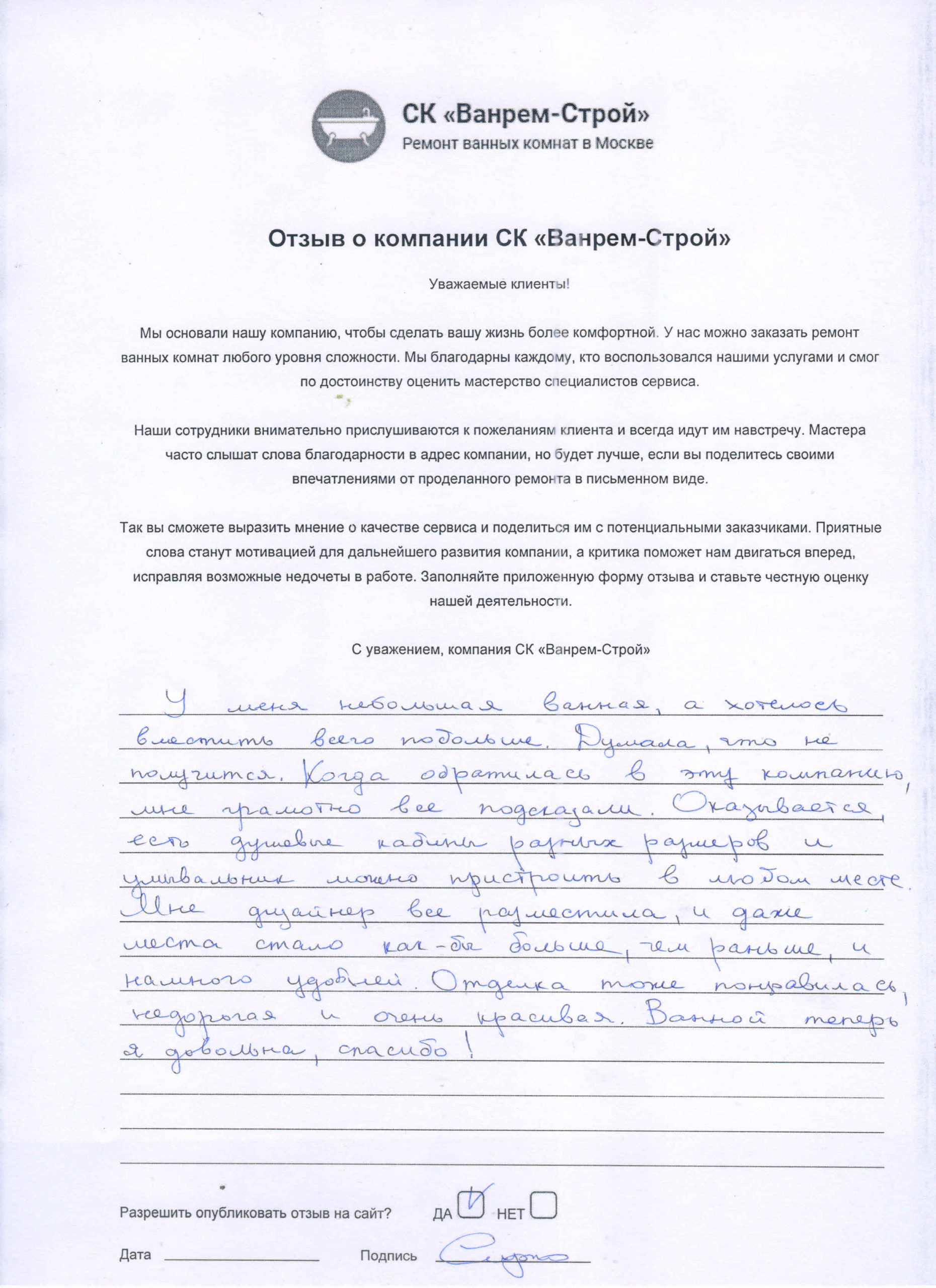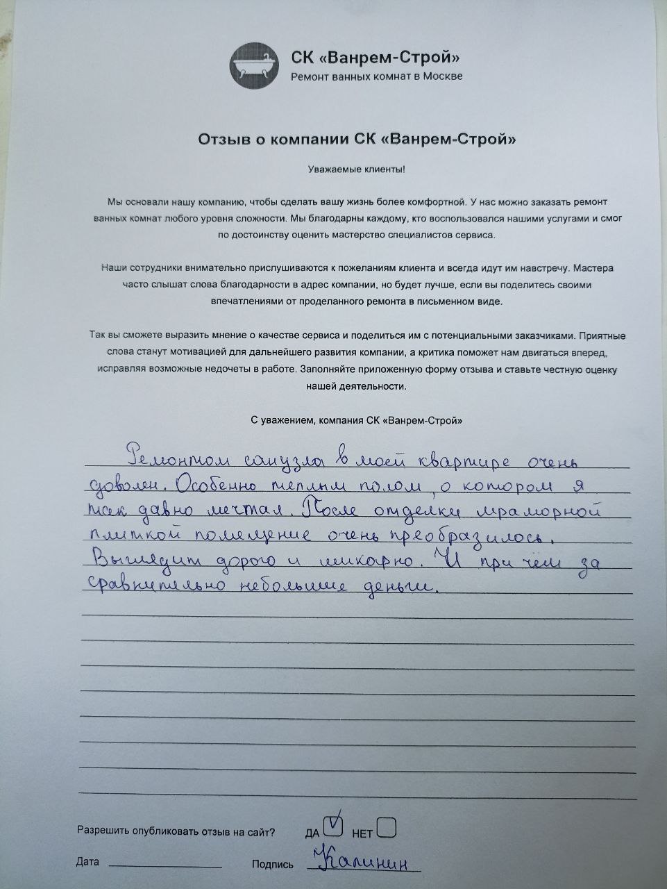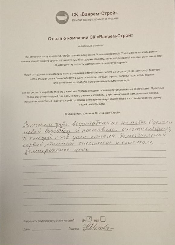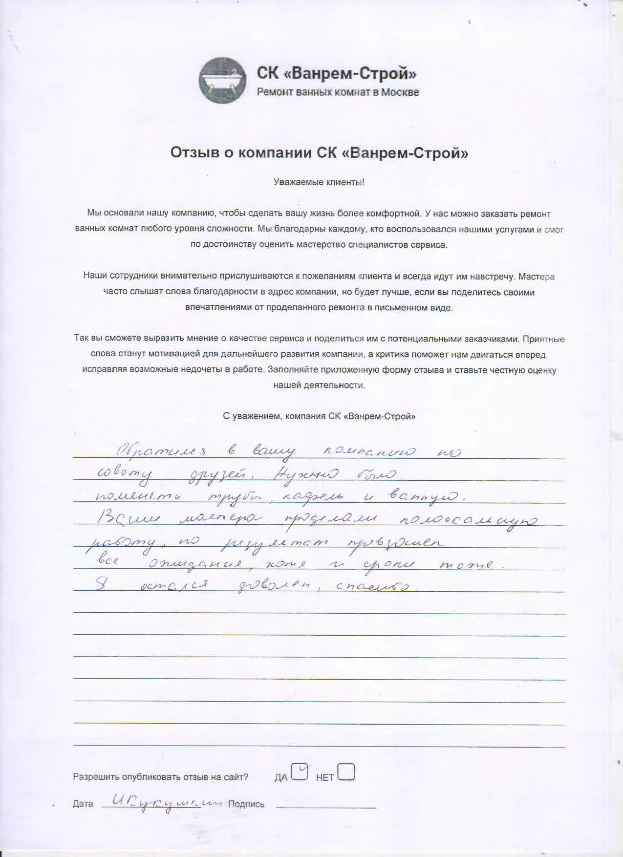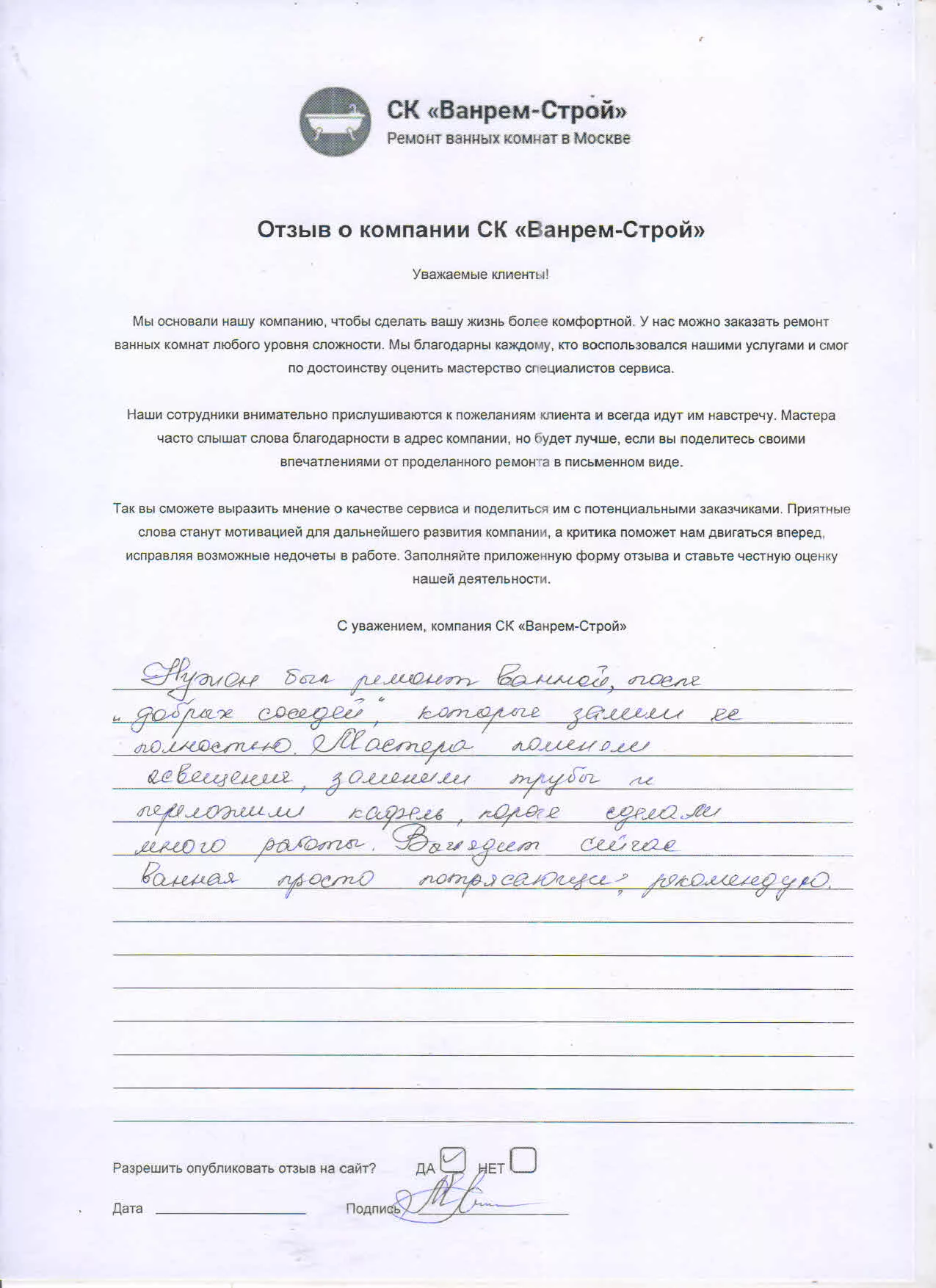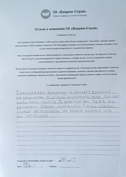 Реальные заказчики дают объективную оценку комплексной работы коллектива сотрудников СК «Ванрем-Строй». Для получения достоверной информации о качестве предоставляемых нами услуг по ремонту ванных комнат, санузлов и туалетов, изучите отзывы клиентов нашей компании.