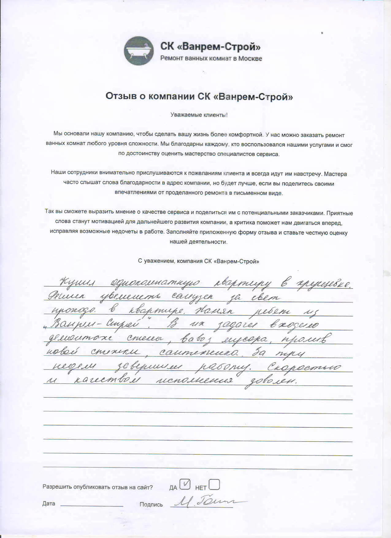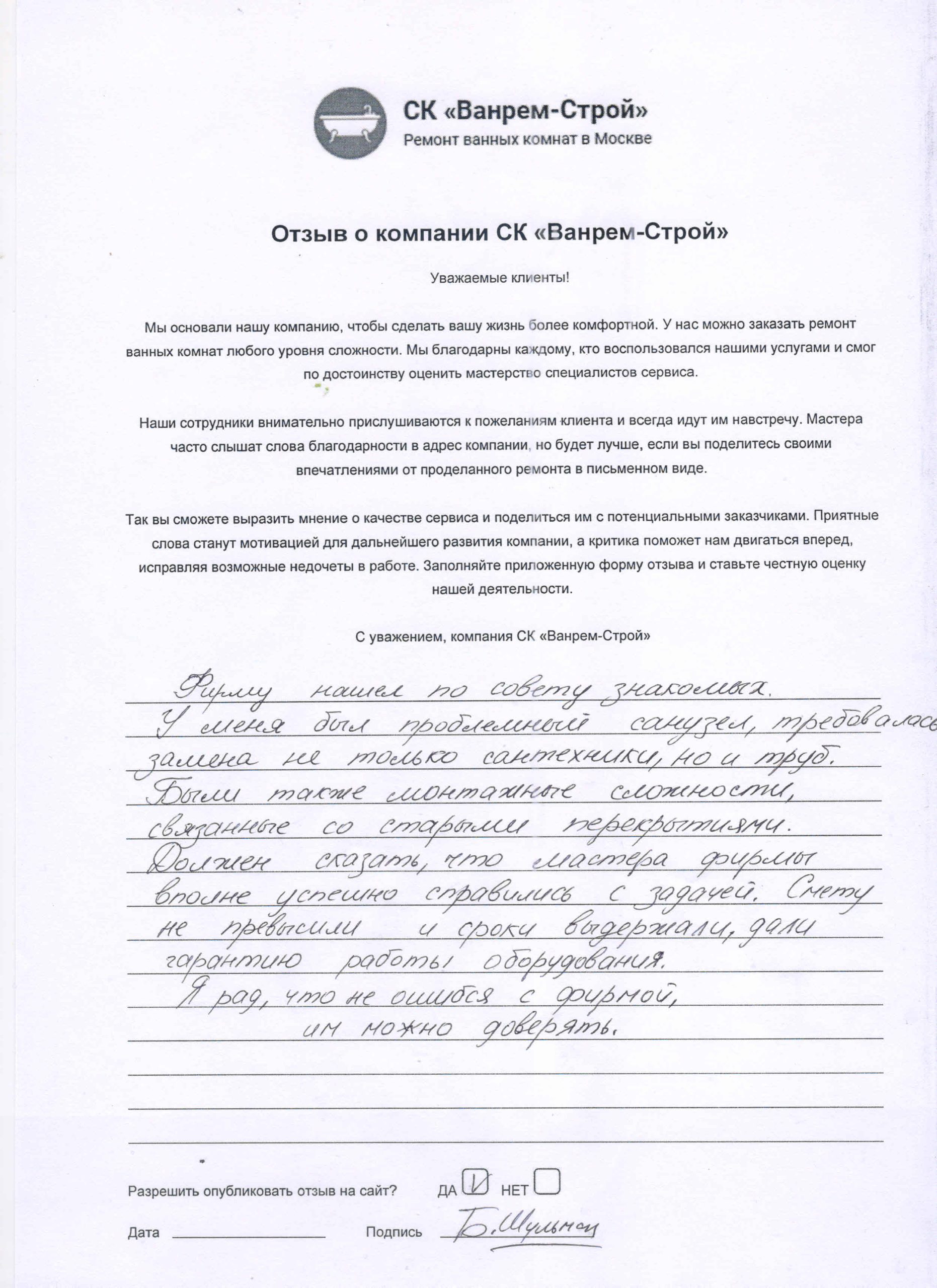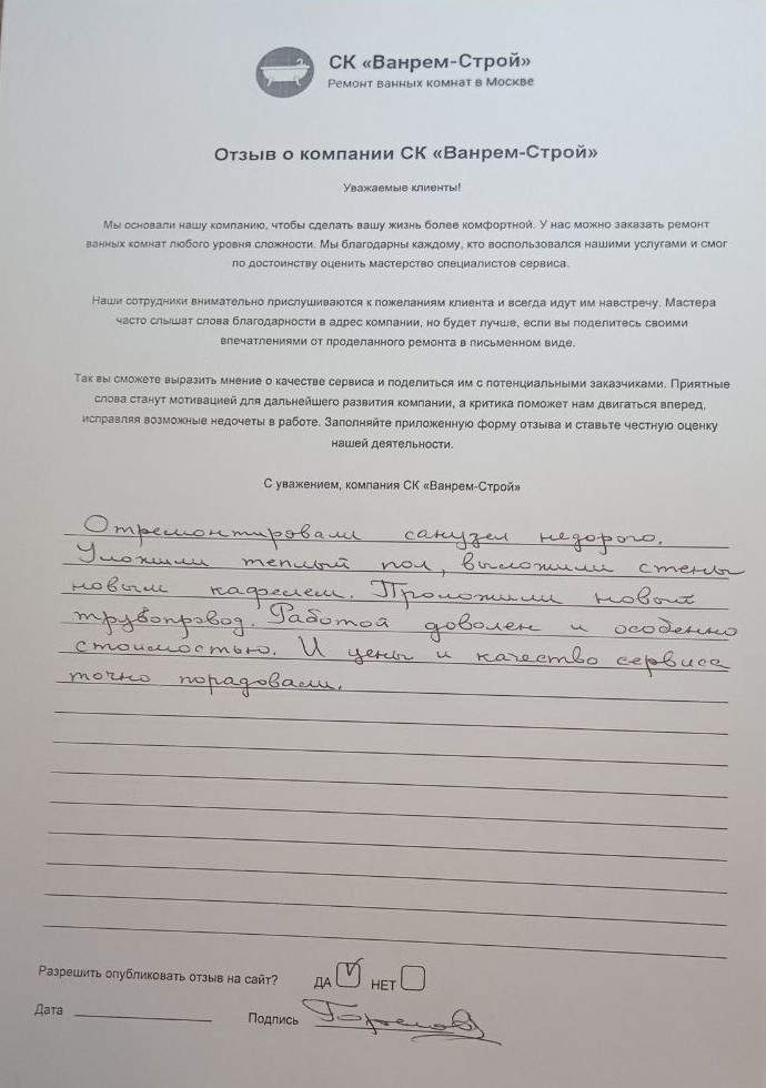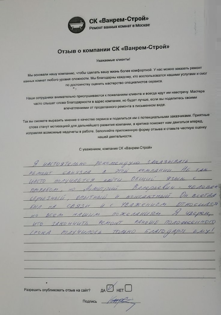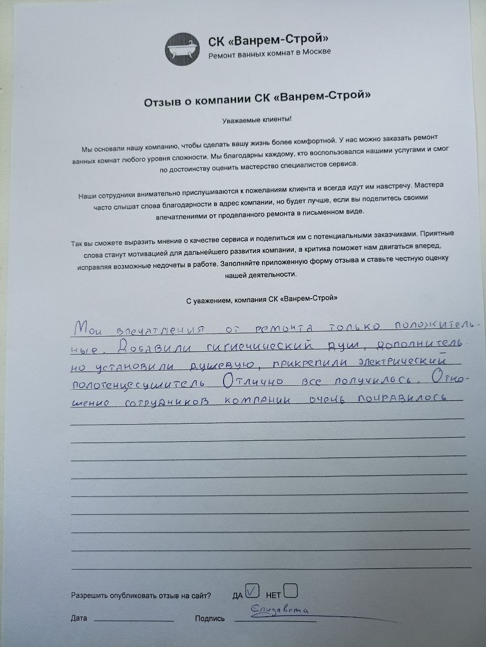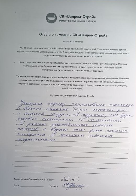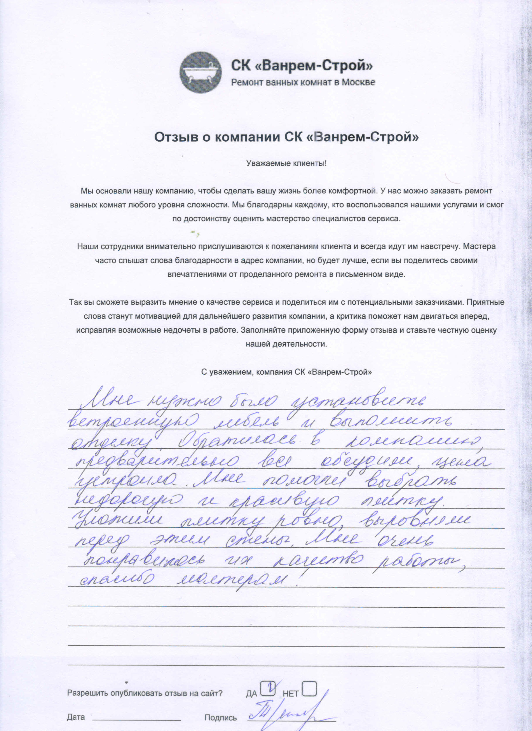 Реальные заказчики дают объективную оценку комплексной работы коллектива сотрудников СК «Ванрем-Строй». Для получения достоверной информации о качестве предоставляемых нами услуг по ремонту ванных комнат, санузлов и туалетов, изучите отзывы клиентов нашей компании.