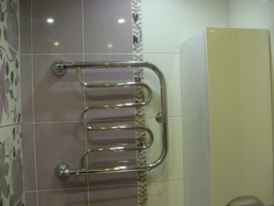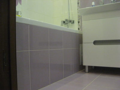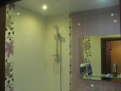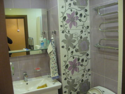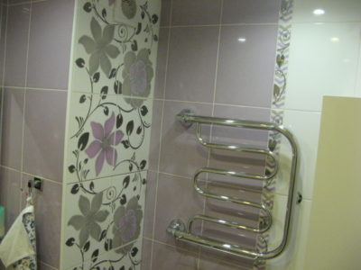Наша компания провела комплекс работ по обновлению интерьера ванной комнаты и туалета в квартире на улице Большая Академическая. Поверхности облицованы плиткой в двух цветах (нежно-сиреневом и кремовом цветах) и украшенной роскошным цветочным принтом. Полностью был заменен дверной блок и установлен подвесной потолок со встроенными точечными светильниками. В совмещенном санузле удалось компактно разместить ванну, мойдодыр, полотенцесушитель и унитаз. Воздуховод скрыт за декоративной панелью, оформленной в тон общему интерьеру. Цена ремонта — 125500 рублей, 32 тыс. — черновые материалы.