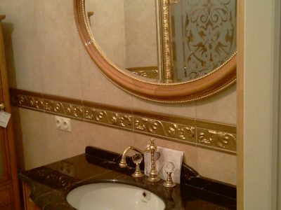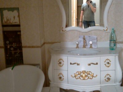 Оба раздельных санузла в квартире в новостройке на Цветном бульваре оформлены в классическом дворцовом стиле. Для поддержания аристократического интерьера мы выбрали круглую ванну на изогнутых ножках, роскошные умывальники с фигурными шкафами и просторный душевой уголок с раздвижной дверкой. Полотенцесушитель и трубы окрашены в благородный бронзовый цвет в тон золотой фурнитуре. В одном санузле установлены напольные унитаз и биде, душевая кабина и рукомойник с тумбой, над которым навешано круглое зеркало в массивной раме. Во втором помещении смонтирована ванна и собран мойдодыр. Отделка стен керамической плиткой двух тонов выполнена по индивидуальному дизайн-проекту. Цена ремонта – 121000 рублей. Стоимость черновых материалов – 28000 руб.
