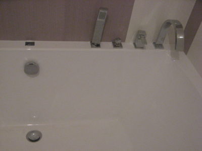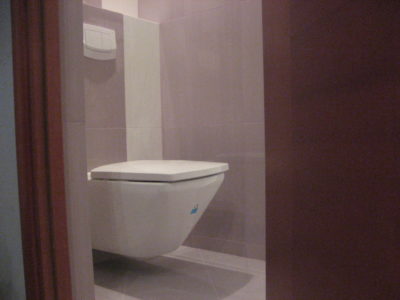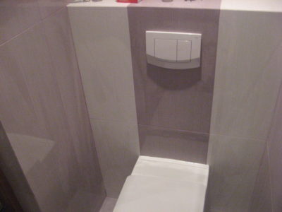 При ремонте раздельного санузла на улице Вавилова мастера полностью демонтировали отделку вплоть до бетона и разобрали старый трубопровод. После укладки стяжки, выравнивания поверхностей и монтажа коммуникаций мы установили на потолок подвесную конструкцию со встроенными светильниками, а пол и стены облицевали крупноформатной керамической плиткой в трендовом бежевом цвете. Прямоугольная ванна занимает всю нишу вдоль глухой стены. Изюминки интерьера: облицованный в тон общей композиции экран, отсутствие привычного умывальника и монтаж крана прямо на торцевой части ванны. В помещении также установлены подвесной унитаз с душем биде и электрический полотенцесушитель. Цена ремонт – 124 тыс. руб. Черновые материалы – 33000 р.