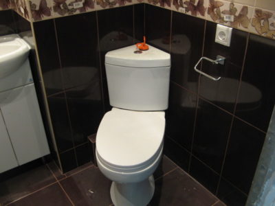 Мы установили унитаз, акриловую ванну с гибким душем, рукомойник со шкафом и зеркалом, а также смонтировали держатели для туалетной бумаги и полотенец. Проведена новая электропроводка и выполнен монтаж электрического полотенцесушителя. Подвесной потолок оформлен пластиковыми панелями со встроенными светильниками. Смета ремонта — 108000 р. Черновые материалы — 36 тыс. руб.