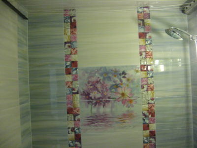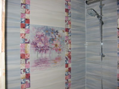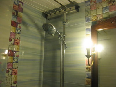 Главными достоинствами дизайна ремонта совмещенного санузла ванной на Сумском проезде стали белоснежные полы, тумба под рукомойник с темно-коричневыми фасадами и декорирование стен флористическими узорами. Изысканности интерьеру придают мозаика вдоль поверхностей и боковые светильники, выполненные в старинном стиле. В небольшом помещении мы установили новую ванну с гибким душем, умывальник со шкафчиком, унитаз, полотенцесушитель и сушилку для белья. Смета на ремонт составила 98 тысяч рублей. На закупку черновых материалов ушло 29 тыс. руб.