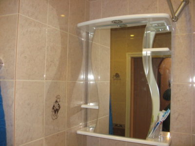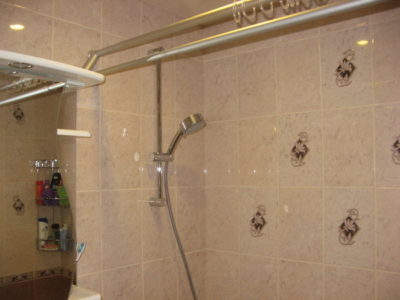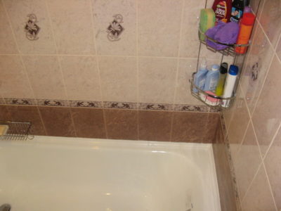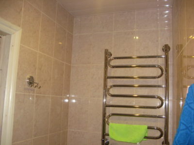 Наша компания выполнила ремонт совмещенного санузла на улице Краснобогатырской. В ходе проведения демонтажных и ремонтно-отделочных работ были полностью заменены отделка поверхностей и установлена новая сантехника (акриловая ванна, мойдодыр, унитаз и электрический полотенцесушитель). Для облицовки стен использовалась бежевая и коричневая керамическая плитка. На пол уложен темный кафель в тон общему интерьеру. Защитный экран под ванной выполнен в виде распашных дверок. Потолок оформлен пластиковыми панелями. Над дверью смонтировано боковое бра. Смета на ремонт — 125000 рублей. Стоимость черновых материалов — 40 тыс. руб.