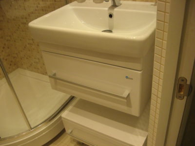 Наша компания выполнила капитальный ремонт совмещенного с ванной комнатой санузла на улице Новочеремушкинская. Для декорирования поверхностей дизайнер выбрала мозаичную плитку двух видов: однотонную и цветную. Благодаря правильно подобранному расположению сантехники малогабаритное помещение выглядит просторным, а за счет теплых оттенков плитки – уютным. В санузле мастера установили полукруглую душевую кабину со стеклянными дверцами и рукомойник с тумбой с правой стороны от входа, а компактный унитаз, полотенцесушитель и стиральную машину – с левой. В подвесной потолок вмонтированы точечные светильники, а на пол уложен кафель светло-бежевого цвета. Цена ремонта – 126 тысячи рублей. Стоимость черновых материалов – 32 тыс. руб