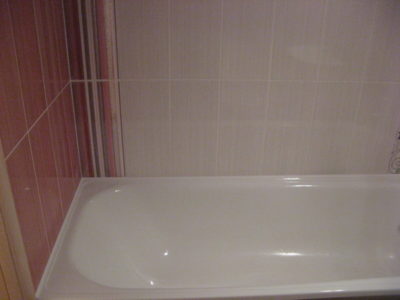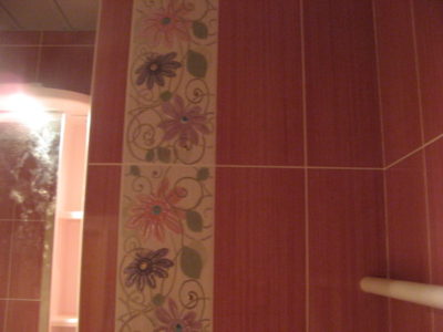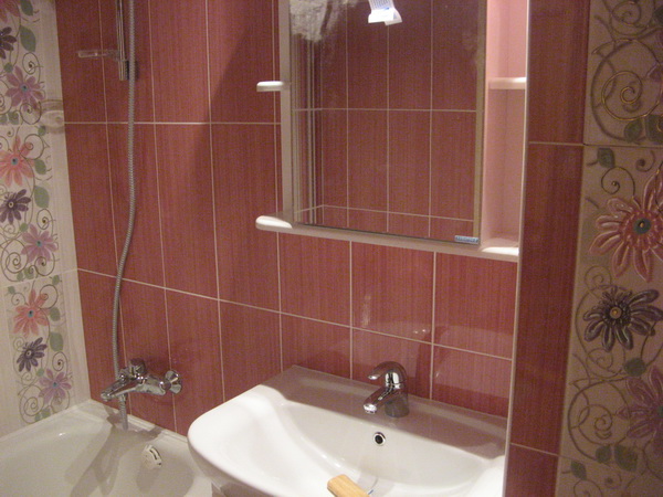 Наша компания выполнила ремонт санузла в городе Видное на улице Школьная. Для облицовки стен мы использовали керамическую плитку нестандартной удлиненной формы бордового и кремового цветов. Такое сочетание позволило зрительно разделить помещение на функциональные зоны. Для нарядности мы выложили вертикальный узор с цветочным орнаментом в двух местах. На пол уложили керамические плиты в тон общему интерьеру. Потолок оформлен пластиковыми панелями. Смонтированы новая ванна с гибким душем, унитаз и мойдодыр с зеркалом. Смета на ремонт составила 98 тысяч рублей. Цена черновых материалов — 31 тыс. руб.