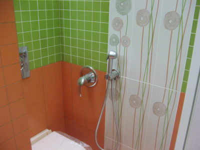 В ходе ремонта совмещенного санузла на улице Тверская мы полностью переоборудовали помещение и разделили комнату на несколько обособленных зон. Подвесной унитаз с душем-биде спрятан за небольшой низкой перегородкой, имитирующей кирпичную кладку, а умывальник установлен прямо у входа и выполнен в виде столика с вмонтированной в столешницу мойкой. Угловую часть помещения занимает габаритная душевая кабина без крыши. Изюминки интерьера: зеркальный потолок, изготовленный из квадратных плиток, яркие цвета, сочные принты и стильная подсветка по всему периметру санузла. Стоимость ремонта – 127 тыс. 500 руб. Черновые материалы обошлись в 34000 руб.