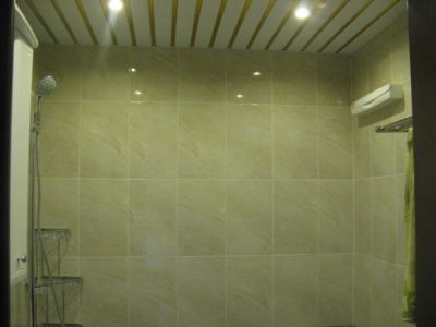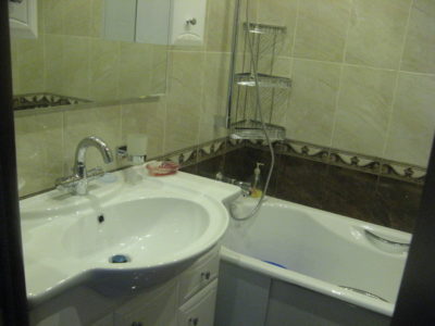 В ванной комнате удалось компактно расположить ванну с боковыми ручками и гибким душем, мойдодыр на три секции и навесные полки. Точечные светильники вмонтированы в подвесной потолок из пластиковых панелей. В туалете установлен новый унитаз, стены облицованы двухцветным кафелем, а на пол уложена керамическая плита с имитацией под мрамор.