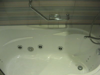 Полы и стены ванной комнаты облицованы керамической плитой с горизонтальным рисунком. В помещении установлены ванна с функцией джакузи, раздвижные шторы, умывальник с тумбой, полка для полотенец, полотенцесушитель, вертикальный шкаф и стиральная машина. Стоимость черновых материалов — 32200 руб. Цена ремонта — 120 тыс. 900 руб.
