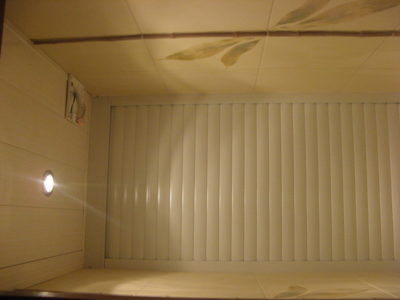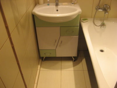 В ходе ремонта были полностью демонтированы устаревшее сантехническое оборудование и отделка с поверхностей. На стены и полы в помещениях уложена керамическая плитка оливкового цвета, а потолок выполнен из пластиковых панелей. Привнести в дизайн нотку элегантности удалось за счет укладки декоративных элементов с имитацией под бамбуковое дерево.