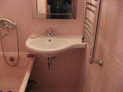 Наша компания выполнила капитальный ремонт ванной комнаты в квартире, расположенной на Звездном бульваре. В ходе работ были полностью демонтированы старые трубы, отделка и сантехника. Для облицовки стен использовались два типа керамической плитки розового цвета: с глянцевой поверхностью и фактурным рисунком. В целях экономии места были установлены подвесной умывальник и лаконичный полотенцесушитель. Ванна смонтирована слева от мойки. На стене над раковиной расположено стильное зеркало. Потолок оформлен пластиковыми панелями, около входа повешен аккуратный светильник с простым плафоном. Стоимость черновых материалов — 19800 руб. Цена работ под ключ — 73000 р.