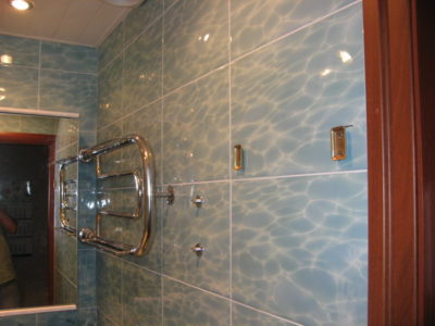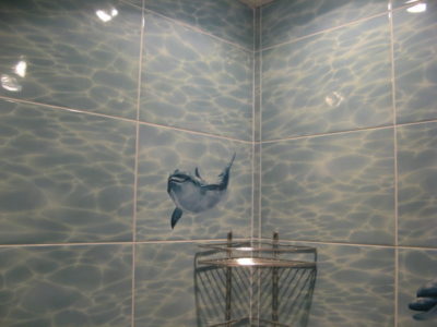 Главным достоинством дизайна при ремонте ванной комнаты в Химках стало декорирование стен керамической плиткой с изображением дельфинов, черепах и других обитателей моря. Мы выполнили отделку стен и пола кафелем нежно-голубого цвета с белыми прослойками. Установили подвесной потолок из пластиковых панелей со встроенными точечными светильниками. Мы смонтировали в комнате ванну с защитным экраном, мойдодыр и электрический полотенцесушитель. Бюджет ремонта составил 64 тысячи рублей. Черновые материалы — 24 тыс. р.